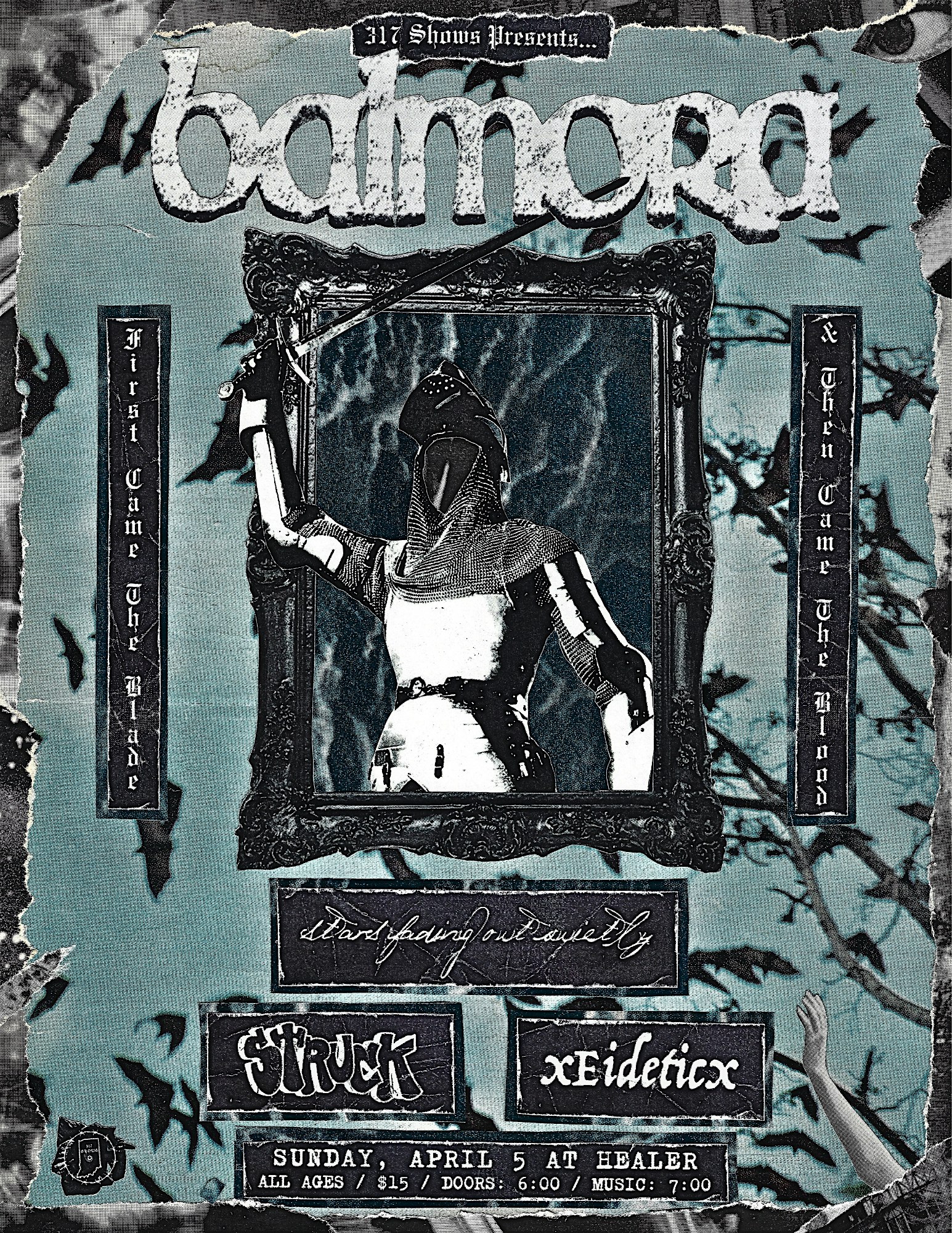 by admin13Feb BALMORA @ HEALER w/ starsfadingoutquietly, Struck, & Eidetic at Healer – Indianapolis, IN BALMORA @ HEALER w/ starsfadingoutquietly, Struck, & Eidetic at Healer – Indianapolis, IN 1 1 people viewed this event. BALMORA IN INDIANAPOLIS. DAZE RECORDS’ CHAMPION OF METALCORE SHARPENS THEIR SWORD ON THE 317. Tickets-RSVP Link Date And Time Sunday, April 5th, 2026 10:00 PM (PST) Venue Healer Location 3631 East Raymond Street, Indianapolis, IN 46203 Event Types Concert or PerformanceMusic Event Category IndianaIndianapolis Share With Friends Facebook Twitter Linkedin Xing Pinterest Share This Post: