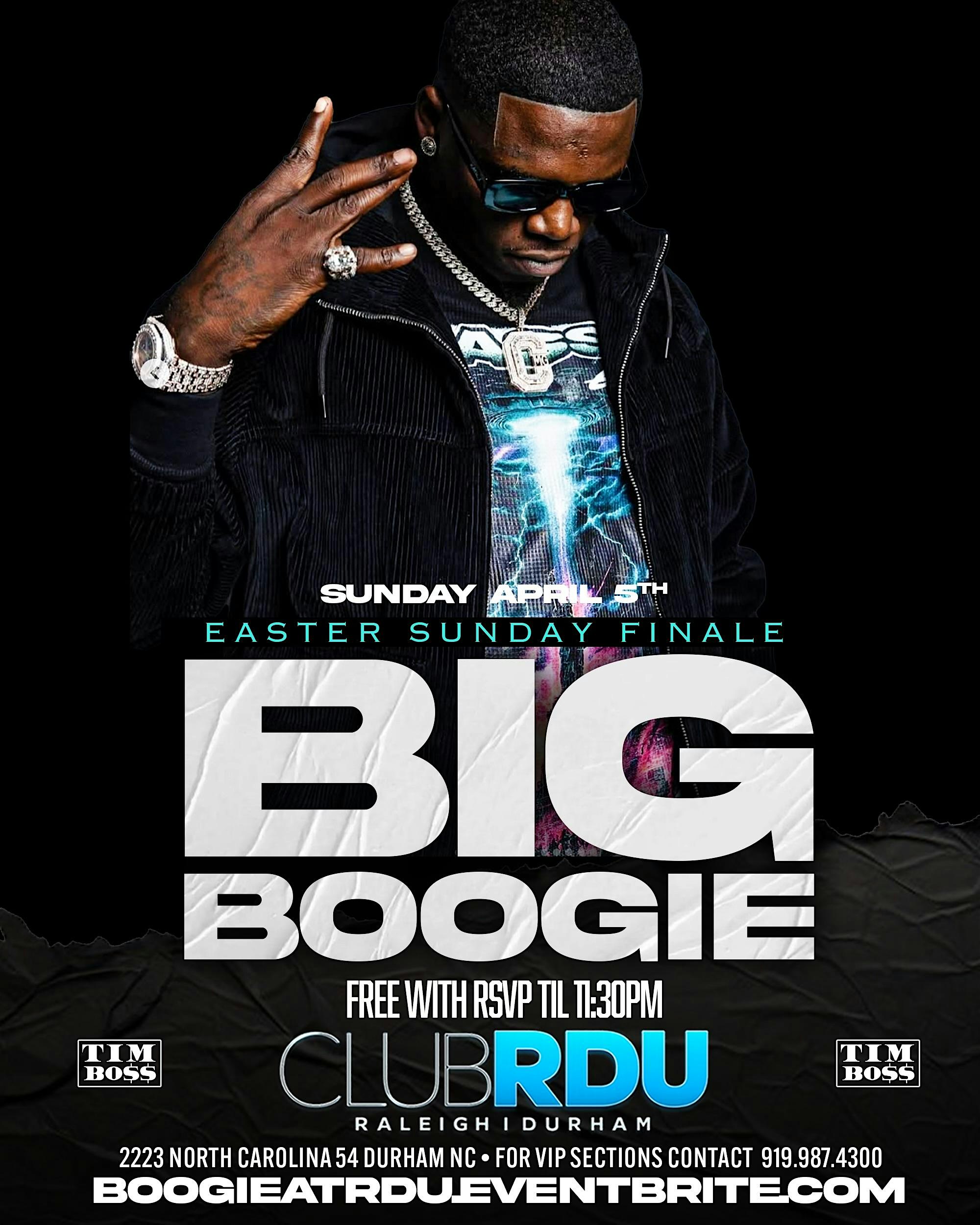 by admin24Feb Big Boogie invades CLUB RDU at 2223 NC-54 – Durham, NC Big Boogie invades CLUB RDU at 2223 NC-54 – Durham, NC 4 4 people viewed this event. Big boogie takes over CLUB RDU for the first time ever , this will be one for the books , for vip sections call 9199874300 Tickets-RSVP Link Date And Time Sunday, April 5th, 2026 10:00 PM (PST) Venue 2223 NC-54 Location 2223 North Carolina 54, Durham, NC 27713 Event Types Concert or PerformanceMusic Event Category DurhamNorth Carolina Share With Friends Facebook Twitter Linkedin Xing Pinterest Share This Post:
