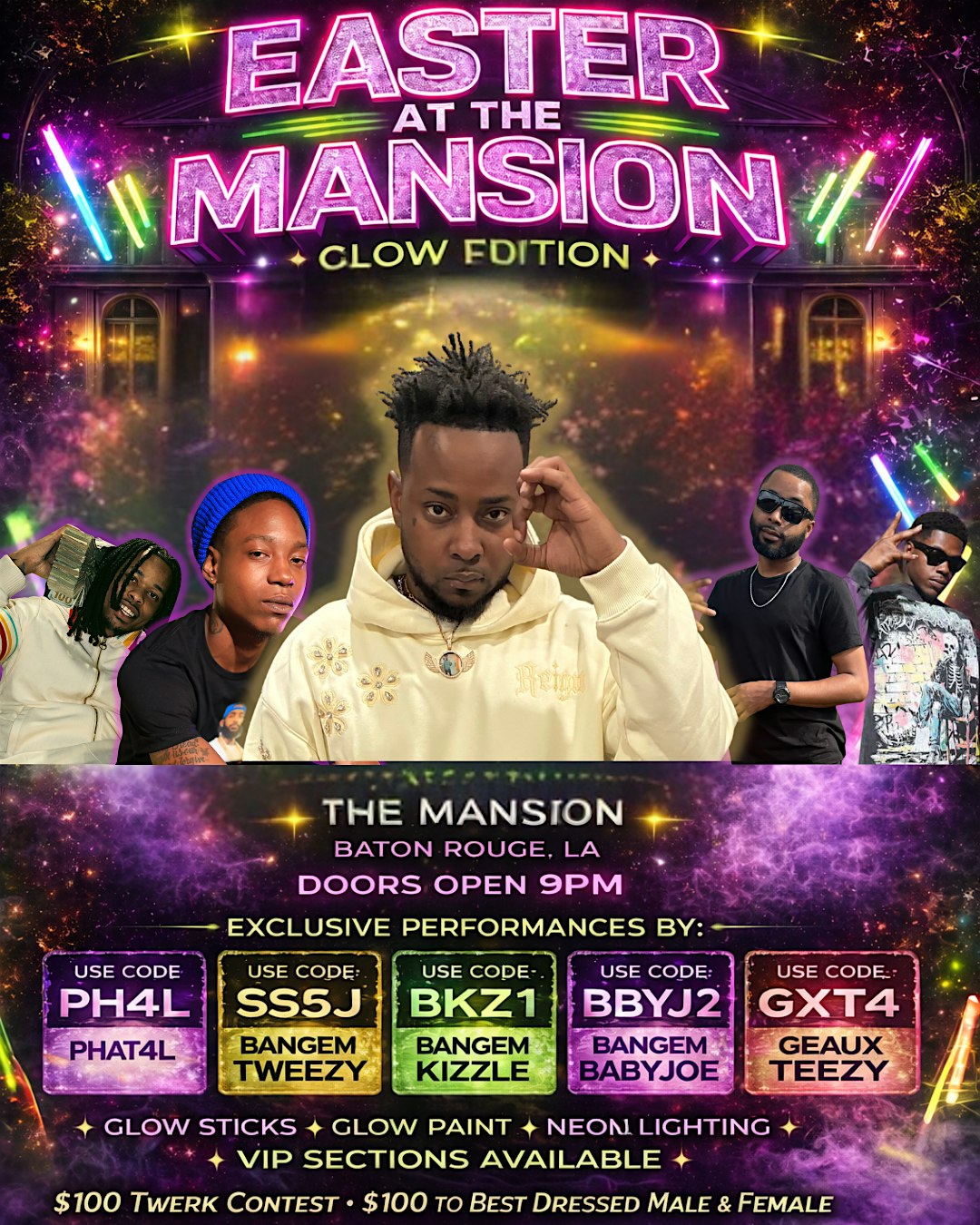 Easter At The Mansion at Mansion NightClub of BR – Baton Rouge, LA Easter At The Mansion at Mansion NightClub of BR – Baton Rouge, LA 4 4 people viewed this event. Easter at The Mansion: Baton Rouges biggest Easter party. Live performances, glow party vibes, VIP sections & $100 contests. Tickets-RSVP Link Register for event Date And Time Sunday, April 5th, 2026 @ 08:00 PM Location 8509 Greenwell Springs Road, Baton Rouge, LA 70814 Event Types Concert or PerformanceSeasonal & Holiday Event Category Baton RougeLouisiana Share With Friends Facebook Twitter Linkedin Xing Pinterest