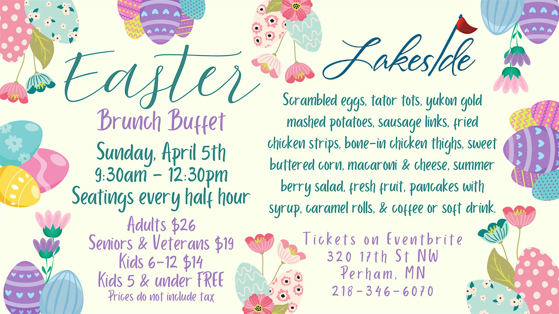 by admin27Feb Easter Brunch Buffet at Perham Lakeside Golf Club – Perham, MN Easter Brunch Buffet at Perham Lakeside Golf Club – Perham, MN 1 1 people viewed this event. Hop into a tasty feast with all your favorite brunch goodies and good vibes this Easter! Perfect for the whole family! Tickets-RSVP Link Date And Time Sunday, April 5th, 2026 09:00 AM (PST) Venue Perham Lakeside Golf Club Location 2727 450th Street, Perham, MN 56573 Event Types Food & Drink Event Category Minnesota Share With Friends Facebook Twitter Linkedin Xing Pinterest Share This Post: