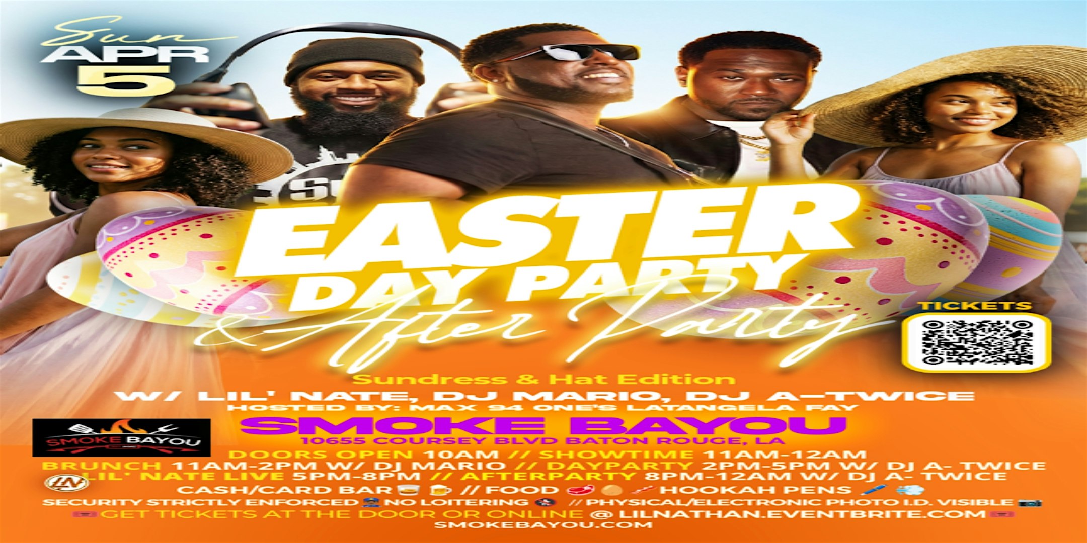 by admin13Feb EASTER DAY PARTY & AFTERPARTY w/LIL’ NATE, DJ MARIO, & DJ A-TWICE at Smoke Bayou – Baton Rouge, LA EASTER DAY PARTY & AFTERPARTY w/LIL’ NATE, DJ MARIO, & DJ A-TWICE at Smoke Bayou – Baton Rouge, LA 2 2 people viewed this event. Tickets-RSVP Link Date And Time Sunday, April 5th, 2026 04:00 PM (PST) Venue Smoke Bayou Location 10655 Coursey Boulevard, Baton Rouge, LA 70816 Event Types Concert or PerformanceMusic Event Category Baton RougeLouisiana Share With Friends Facebook Twitter Linkedin Xing Pinterest Share This Post: