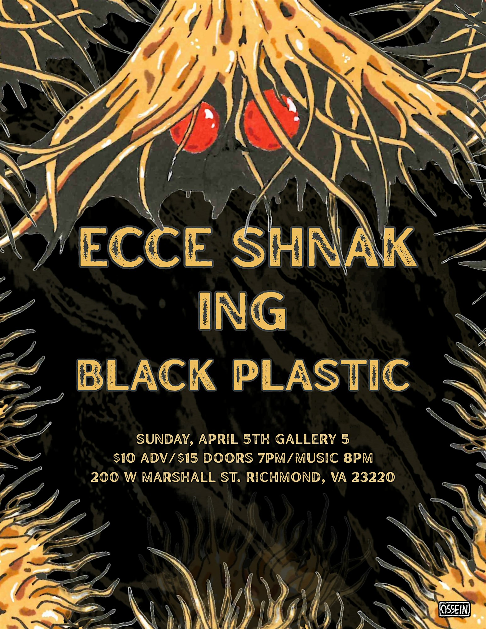 Ecce Shnak (nyc), Ing, & Black Plastic at Gallery5 – Richmond, VA Ecce Shnak (nyc), Ing, & Black Plastic at Gallery5 – Richmond, VA 2 2 people viewed this event. Do not miss this rare opportunity to catch the one and only Ecce Shnak here in Richmond! Tickets-RSVP Link Register for event Date And Time Sunday, April 5th, 2026 @ 06:00 PM Location 200 West Marshall Street, Richmond, VA 23220 Event Types Concert or PerformanceMusic Event Category Virginia Share With Friends Facebook Twitter Linkedin Xing Pinterest