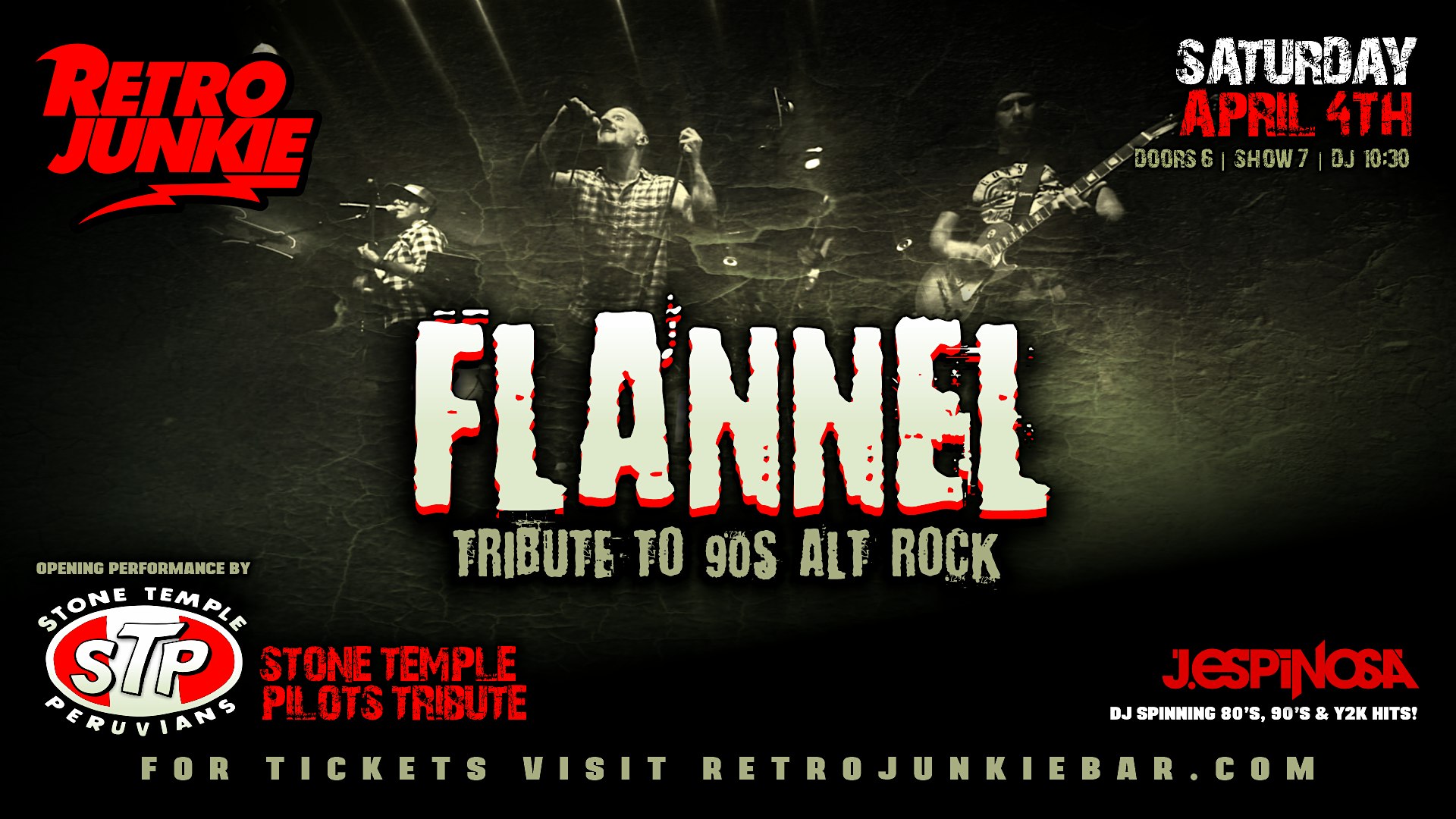 by admin22Feb FLANNEL (Tribute to 90s Alt Rock) + STP (Stone Temple Peruvians)… LIVE! at Retro Junkie – Walnut Creek, CA FLANNEL (Tribute to 90s Alt Rock) + STP (Stone Temple Peruvians)… LIVE! at Retro Junkie – Walnut Creek, CA 1 1 people viewed this event. FLANNEL (Tribute to 90s Alt Rock) + STP (Stone Temple Peruvians)… LIVE! Tickets-RSVP Link Date And Time Sunday, April 5th, 2026 @ 01:00 AM Location 2112 North Main Street, Walnut Creek, CA 94596 Event Types Concert or PerformanceMusic Event Category CaliforniaOakland Share With Friends Facebook Twitter Linkedin Xing Pinterest Share This Post: