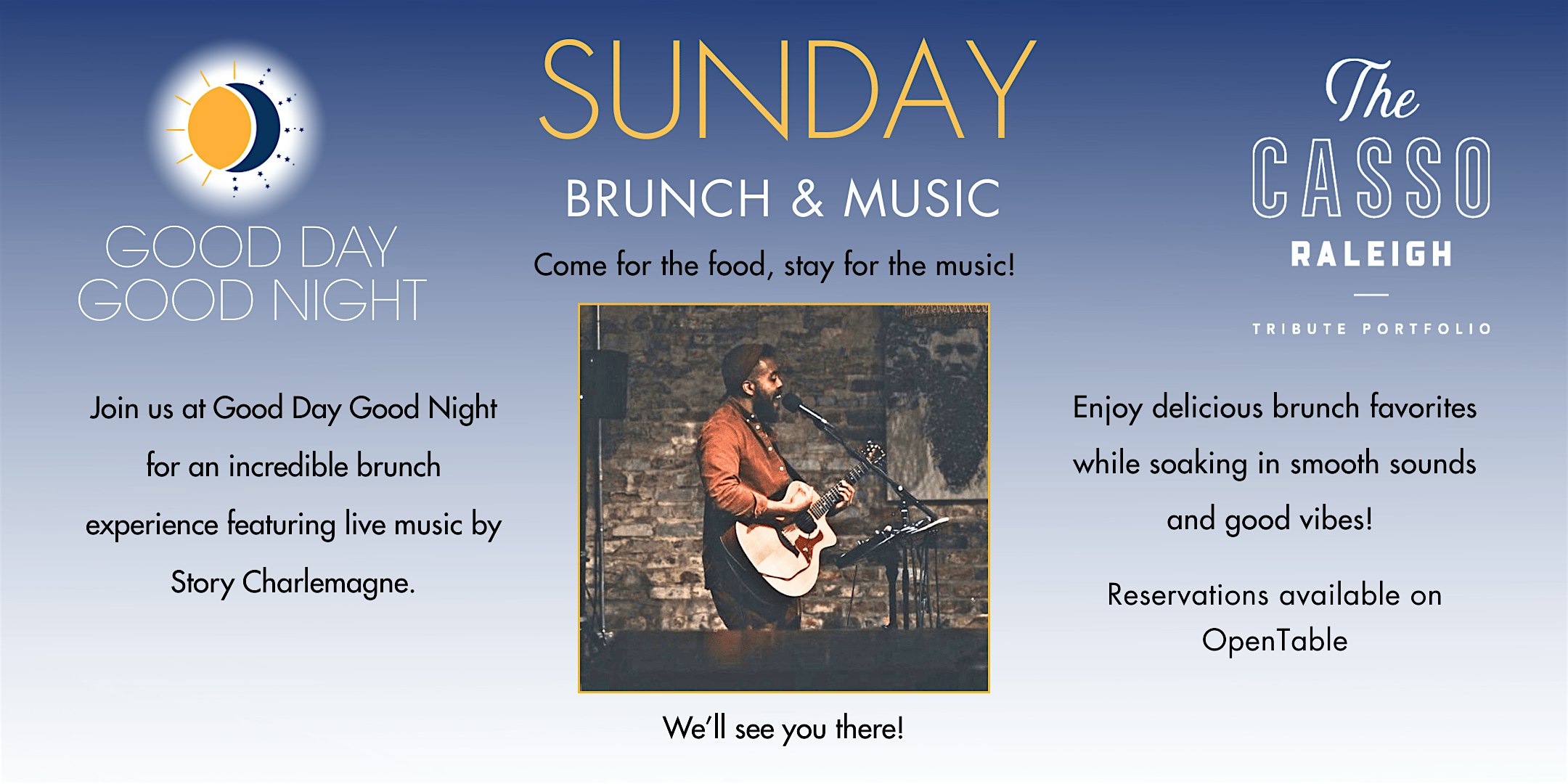 Live Music Sunday Brunch at 603 W Morgan St – Raleigh, NC Live Music Sunday Brunch at 603 W Morgan St – Raleigh, NC 3 3 people viewed this event. Join us at Good Day Good Night for an incredible brunch experience featuring live music by Story Charlemagne. Tickets-RSVP Link Register for event Date And Time Sunday, April 5th, 2026 @ 09:00 AM Location 603 West Morgan Street, Raleigh, NC 27603 Event Types Concert or PerformanceFood & Drink Event Category North CarolinaRaleigh Share With Friends Facebook Twitter Linkedin Xing Pinterest