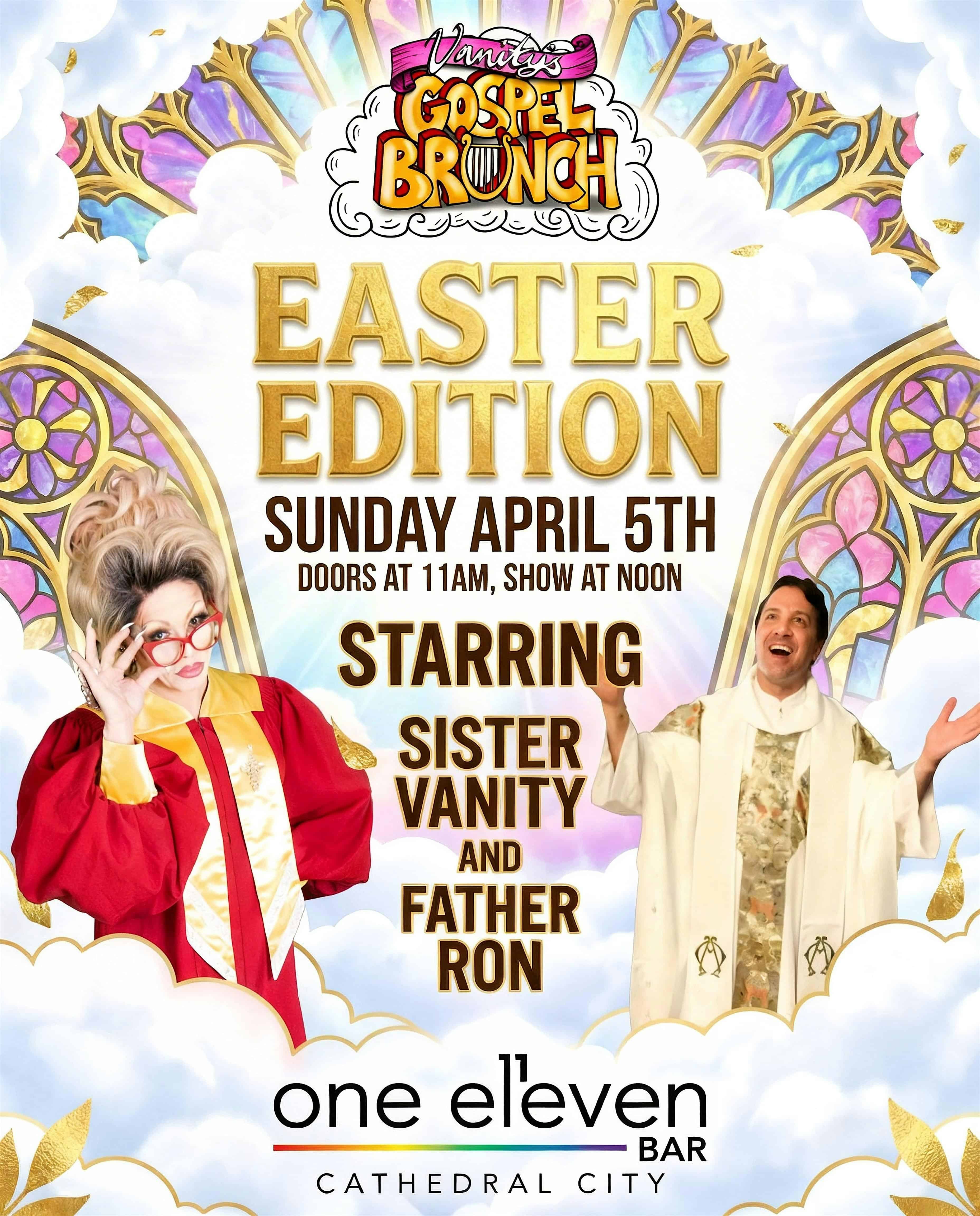 by admin23Feb Vanity’s Gospel Brunch: Easter Eleganza – April 5th at one eleven bar – Cathedral City, CA Vanity’s Gospel Brunch: Easter Eleganza – April 5th at one eleven bar – Cathedral City, CA 2 2 people viewed this event. Get ready to praise, slay, and brunch your way to salvation! Prepare for an Easter service with extra sparkle and a plenty of sass. Tickets-RSVP Link Date And Time Sunday, April 5th, 2026 12:00 PM (PST) Venue one eleven bar Location 67555 East Palm Canyon Drive, Cathedral City, CA 92234 Event Types Party or Social GatheringPerforming & Visual Arts Event Category California Share With Friends Facebook Twitter Linkedin Xing Pinterest Share This Post: