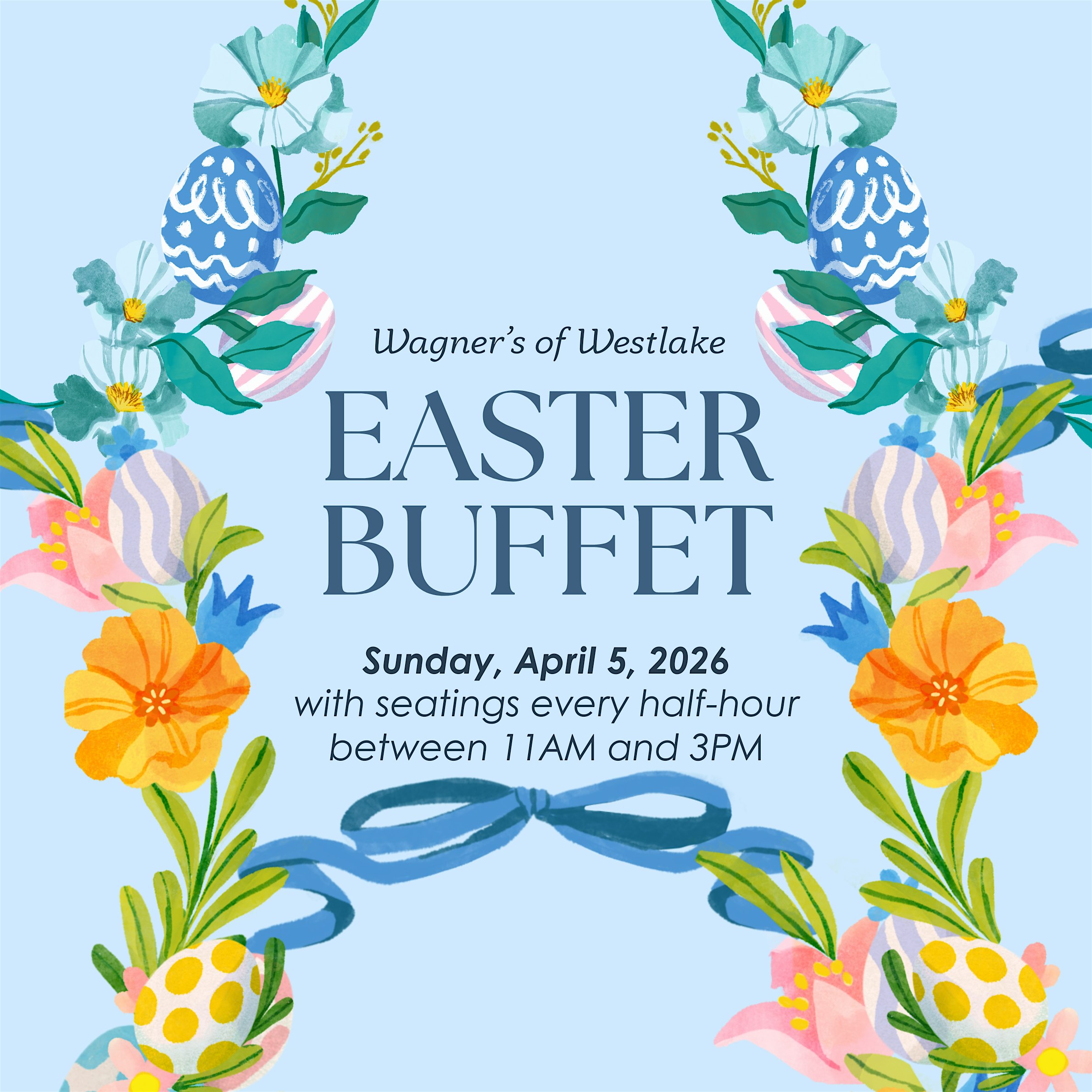 by admin27Feb Wagner’s – Annual Easter Buffet at Wagner’s of Westlake – Westlake, OH Wagner’s – Annual Easter Buffet at Wagner’s of Westlake – Westlake, OH 1 1 people viewed this event. Enjoy time with your loved ones at our annual Easter Buffet! Tickets-RSVP Link Date And Time Sunday, April 5th, 2026 11:00 AM (PST) Venue Wagner's of Westlake Location 30855 Center Ridge Road, Westlake, OH 44145 Event Types Food & Drink Event Category ClevelandOhio Share With Friends Facebook Twitter Linkedin Xing Pinterest Share This Post: