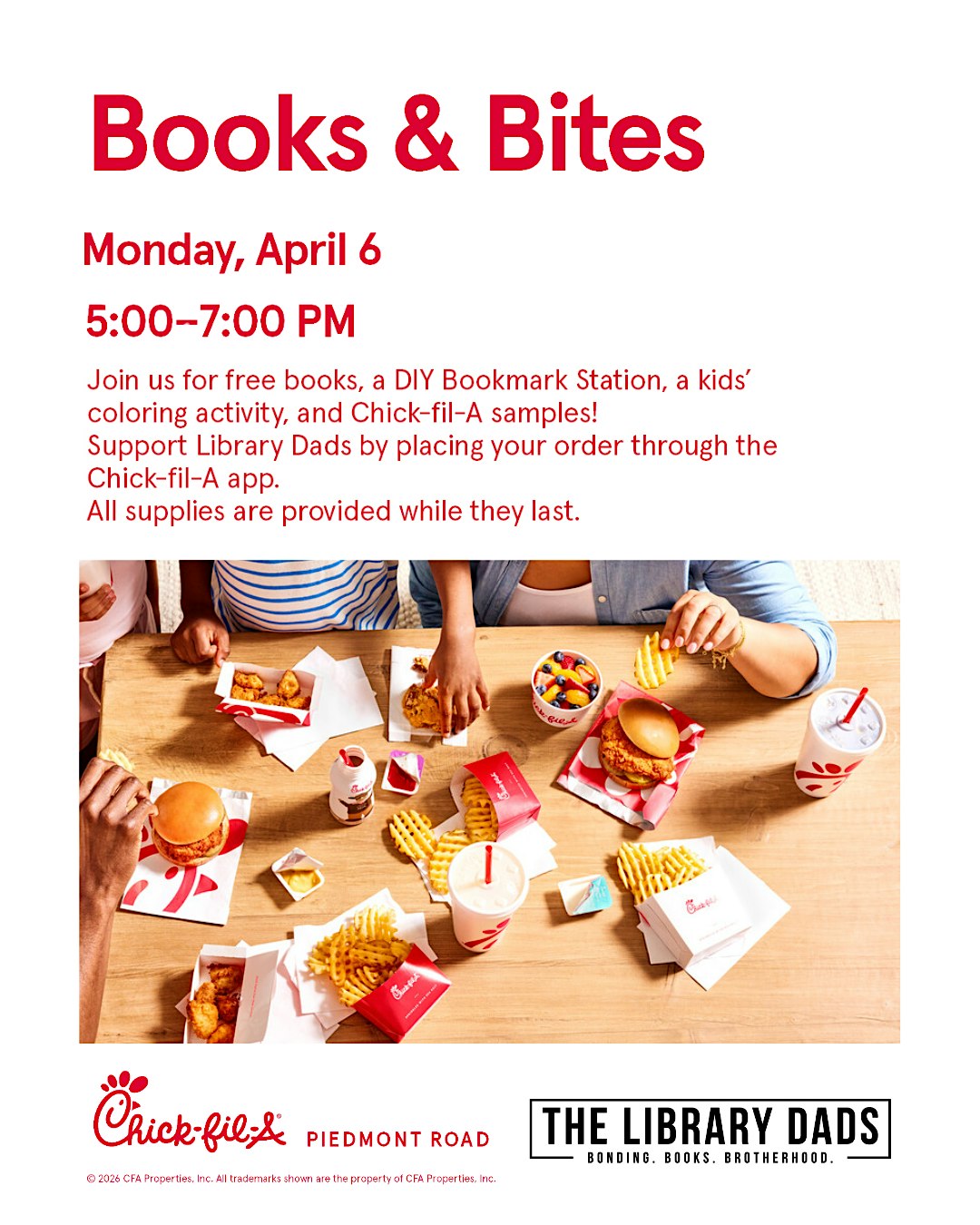 Join us for Books & Bites with The Library Dads. This is a free community event for all ages. Follow our Instagram for updates @cfapiedmontrd. We can’t wait to see you there!