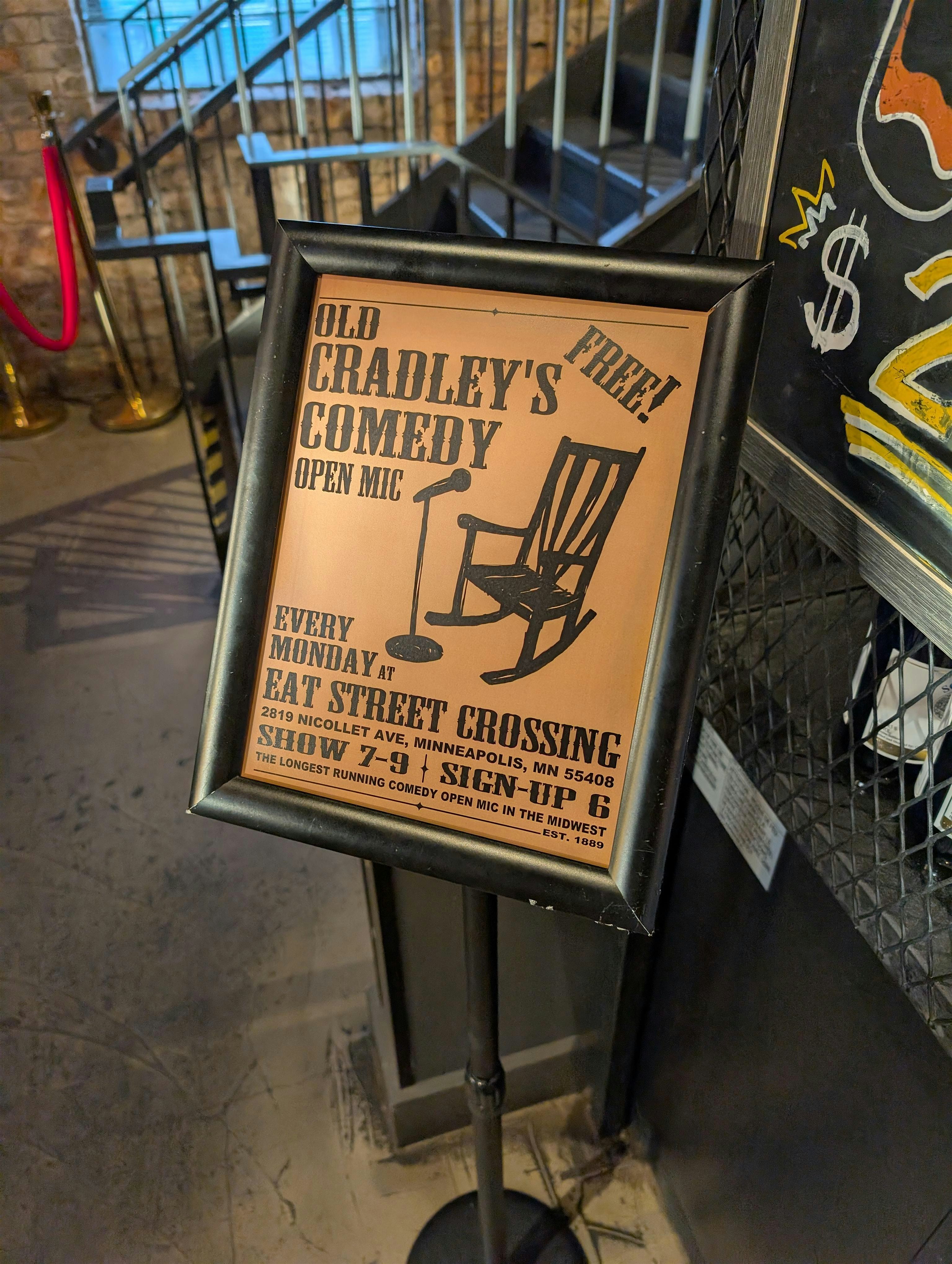 Old Cradley’s Comedy at Eat Street Crossing – Minneapolis, MN Old Cradley’s Comedy at Eat Street Crossing – Minneapolis, MN 2 2 people viewed this event. Come see funny people or give stand-up a try yourself! Tickets-RSVP Link Register for event Date And Time Monday, April 6th, 2026 @ 07:00 PM Location 2819 Nicollet Avenue, Minneapolis, MN 55408 Event Types ComedyConcert or PerformancePerforming & Visual Arts Event Category MinneapolisMinnesota Share With Friends Facebook Twitter Linkedin Xing Pinterest