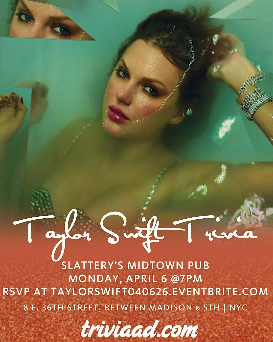 by admin13Feb Taylor Swift Trivia at Slattery’s Midtown Pub – New York, NY Taylor Swift Trivia at Slattery’s Midtown Pub – New York, NY 1 1 people viewed this event. “Cause darling I’m a nightmare dressed like a daydream…” Tickets-RSVP Link Date And Time Monday, April 6th, 2026 11:00 PM (PST) Venue Slattery's Midtown Pub Location 8 East 36th Street, New York, NY 10016 Event Types Music Event Category New YorkNew York City Share With Friends Facebook Twitter Linkedin Xing Pinterest Share This Post: