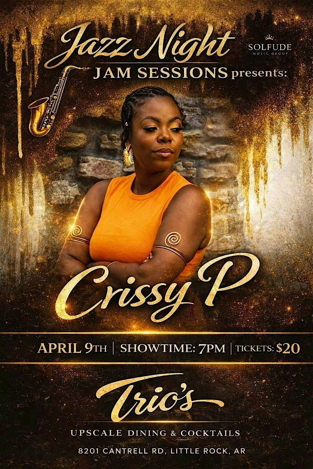 Jazz Night featuring Crissy P at Trio’s Pavilion Room – Little Rock, AR Jazz Night featuring Crissy P at Trio’s Pavilion Room – Little Rock, AR 3 3 people viewed this event. A bi- weekly jazz jam session & more with the region’s finest. Food & drinks available for purchase. Ticket only includes entertainment. Tickets-RSVP Link Register for event Date And Time Tuesday, April 7th, 2026 @ 07:00 PM Location 8201 Cantrell Road, Little Rock, AR 72227 Event Types Concert or PerformanceMusic Event Category ArkansasLittle Rock Share With Friends Facebook Twitter Linkedin Xing Pinterest