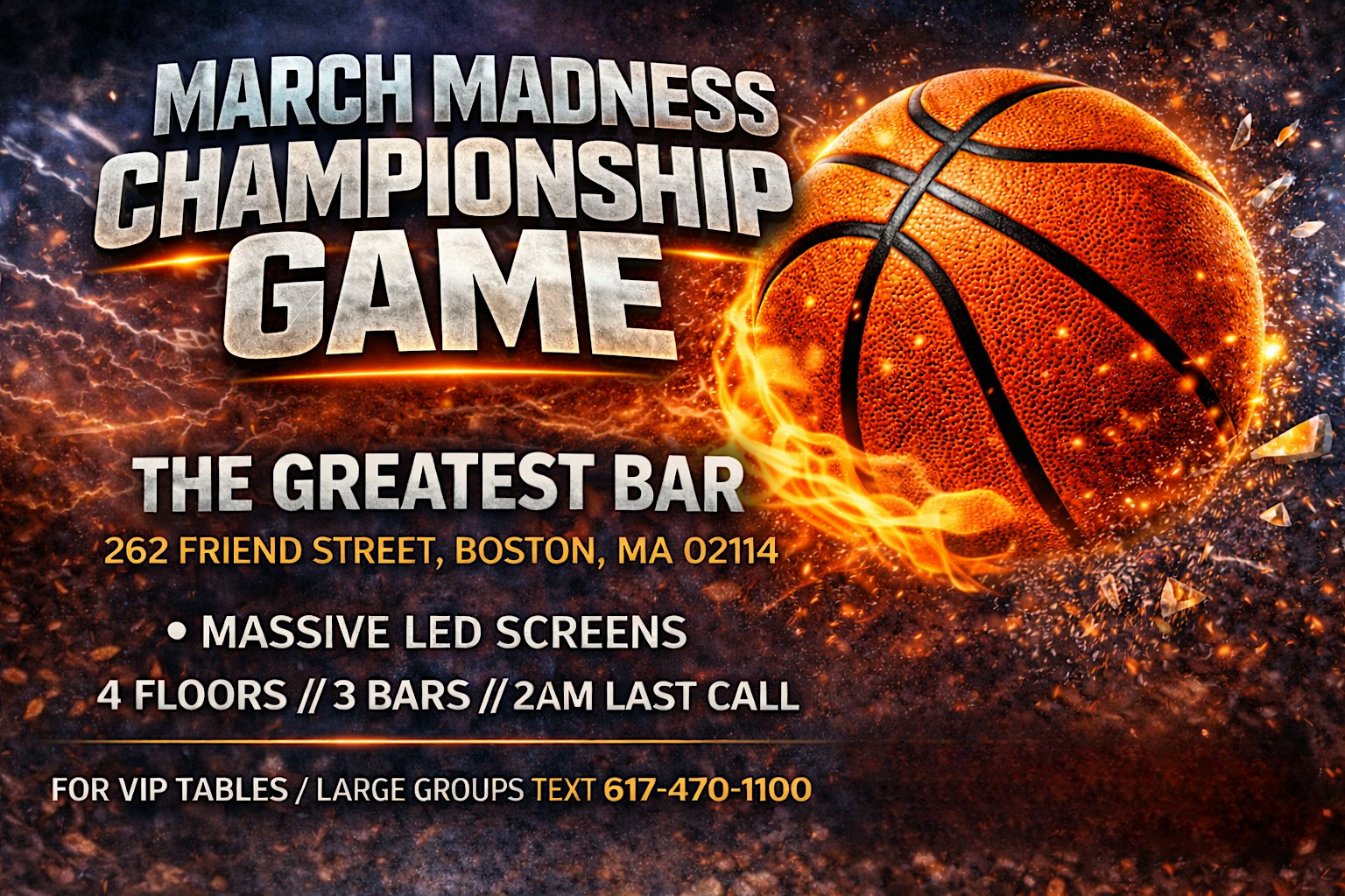 by admin13Feb March Madness Championship Game at The Greatest Bar at The Greatest Bar – Boston, MA March Madness Championship Game at The Greatest Bar at The Greatest Bar – Boston, MA 1 1 people viewed this event. March Madness Championship Game at The Greatest Bar | 4 floors, massive TVs, food & drinks all night | Monday, April 6th Tickets-RSVP Link Date And Time Tuesday, April 7th, 2026 12:00 AM (PST) Venue The Greatest Bar Location 262 Friend Street, Boston, MA 2114 Event Types Party or Social GatheringSports & Fitness Event Category BostonMassachusetts Share With Friends Facebook Twitter Linkedin Xing Pinterest Share This Post: