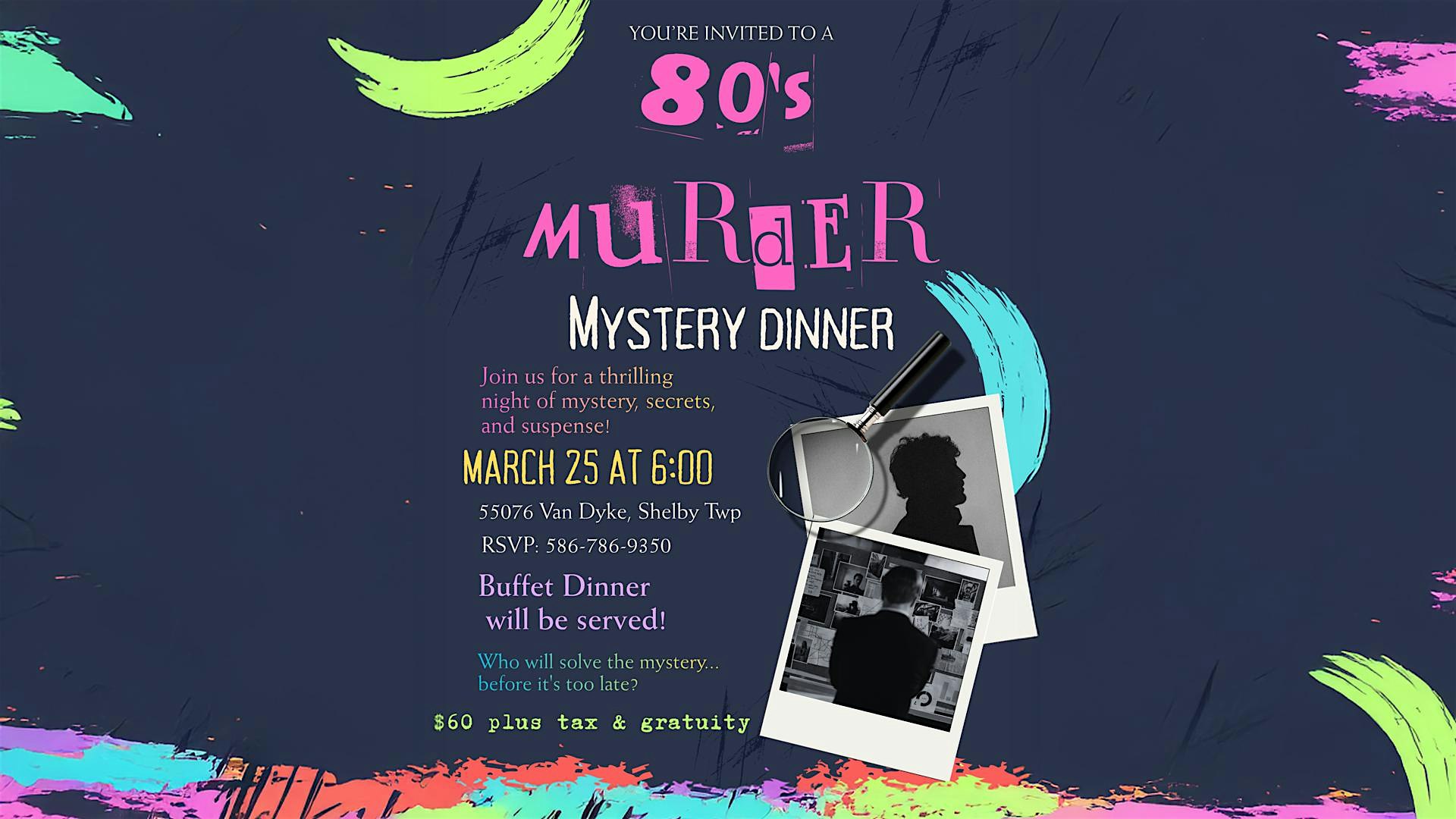 by admin27Feb Murder Mystery Dinner at Hamlin Pub – Shelby Township, MI Murder Mystery Dinner at Hamlin Pub – Shelby Township, MI 1 1 people viewed this event. Break out the neon, tease up that hair, and get ready for a totally rad night of mystery, secrets, and suspense. Tickets-RSVP Link Date And Time Tuesday, April 7th, 2026 10:00 AM (PST) Venue Hamlin Pub Location 55076 Van Dyke Avenue, Shelby Township, MI 48316 Event Types Food & Drink Event Category Michigan Share With Friends Facebook Twitter Linkedin Xing Pinterest Share This Post: