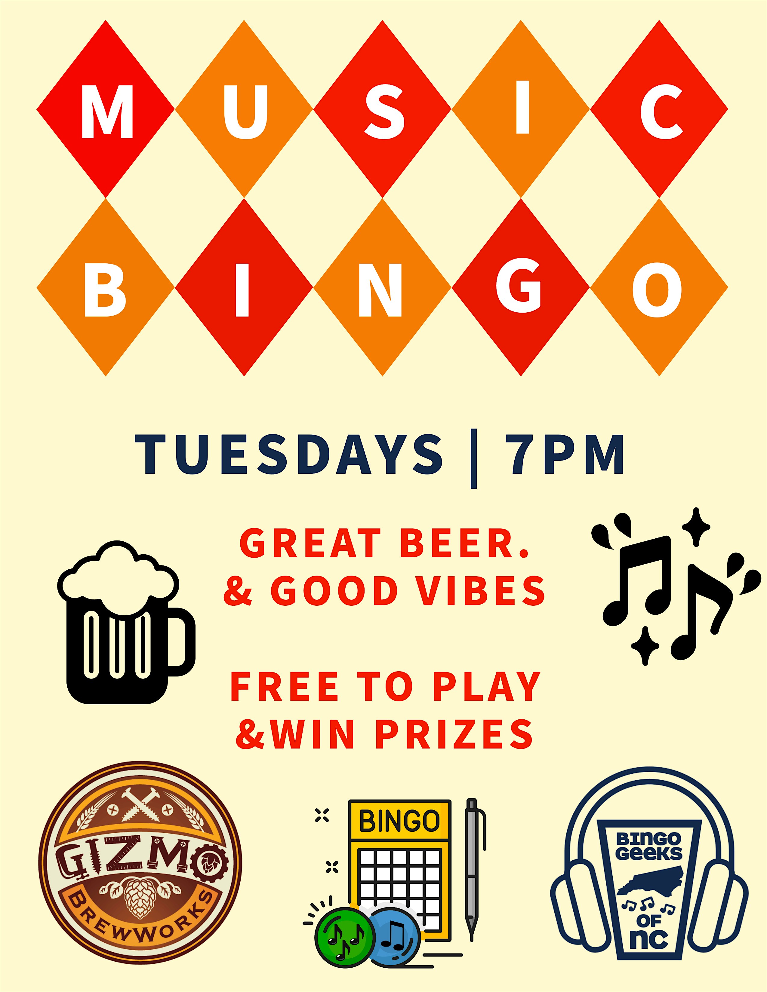 Music Bingo at Gizmo Raleigh! at Gizmo Brew Works – Brewery & Taproom – Raleigh, NC Music Bingo at Gizmo Raleigh! at Gizmo Brew Works – Brewery & Taproom – Raleigh, NC 1 1 people viewed this event. Join us at Gizmo Raleigh for a fun night of Music Bingo – test your music knowledge and win cool prizes! Tickets-RSVP Link Register for event Date And Time Tuesday, April 7th, 2026 @ 07:00 PM Location 5907 Triangle Drive, Raleigh, NCĀ 27617 Event Types Food & DrinkGame or Competition Event Category North CarolinaRaleigh Share With Friends Facebook Twitter Linkedin Xing Pinterest