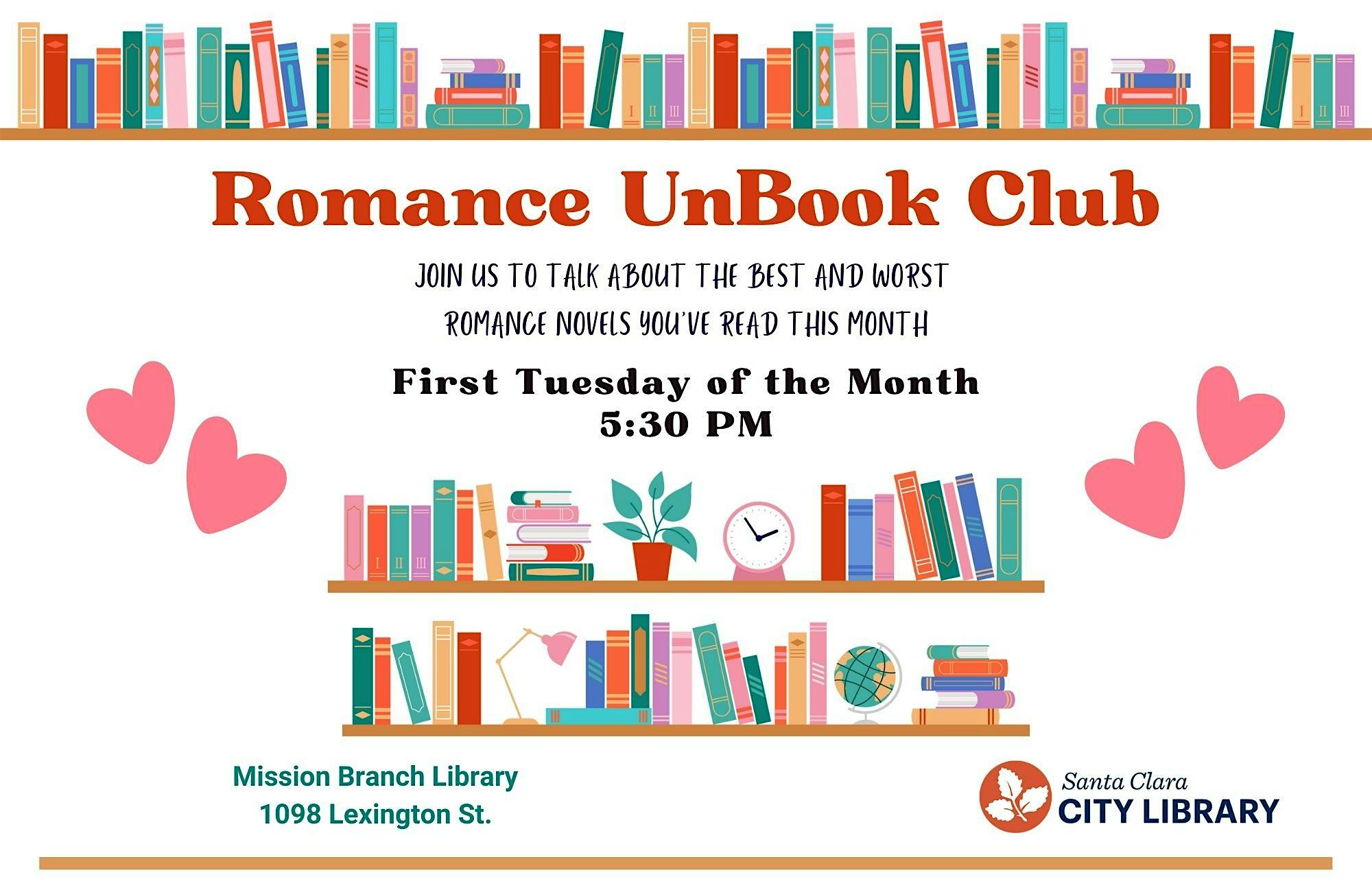by admin24Feb Romance UnBook Club at Mission Branch Library (City of Santa Clara Library System) – Santa Clara, CA Romance UnBook Club at Mission Branch Library (City of Santa Clara Library System) – Santa Clara, CA 3 3 people viewed this event. Join us to talk about the best and worst Romance Novels you’ve read this month! Tickets-RSVP Link Date And Time Tuesday, April 7th, 2026 05:00 PM (PST) Venue Mission Branch Library (City of Santa Clara Library System) Location 1098 Lexington Street, Santa Clara, CA 95050 Event Types Community & CultureParty or Social Gathering Event Category CaliforniaSan Jose Share With Friends Facebook Twitter Linkedin Xing Pinterest Share This Post: