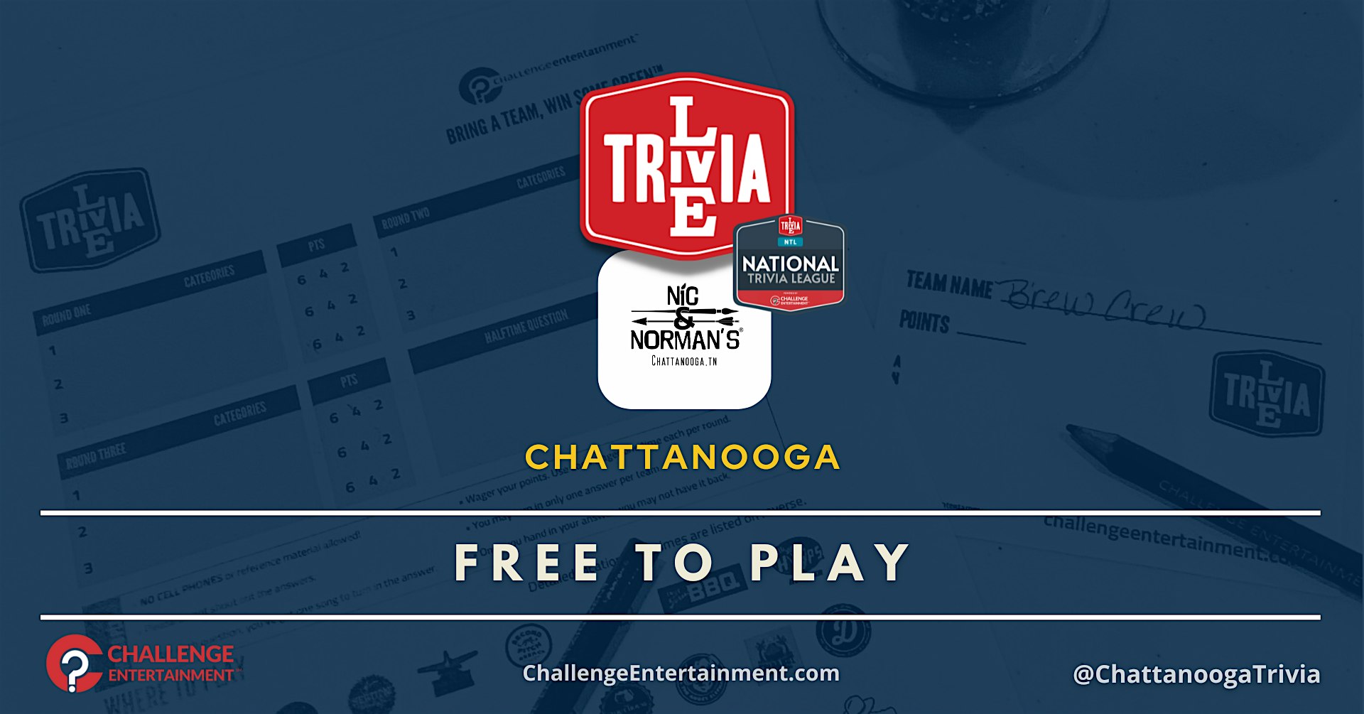 Weekly Live Trivia Nights at Nic & Norman’s – Chattanooga at Nic & Norman’s Chattanooga – Chattanooga, TN Weekly Live Trivia Nights at Nic & Norman’s – Chattanooga at Nic & Norman’s Chattanooga – Chattanooga, TN 1 1 people viewed this event. Weekly Live Trivia Nights at Nic & Norman’s – Chattanooga Tickets-RSVP Link Register for event Date And Time Tuesday, April 7th, 2026 @ 07:00 PM Location 1386 Market Street, Chattanooga, TNĀ 37402 Event Types Food & DrinkGame or Competition Event Category ChattanoogaTennessee Share With Friends Facebook Twitter Linkedin Xing Pinterest