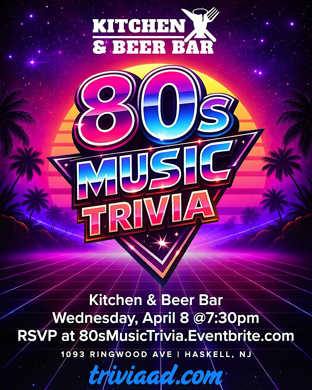 by admin13Feb 80s Music Trivia at Kitchen and Beer Bar – Wanaque, NJ 80s Music Trivia at Kitchen and Beer Bar – Wanaque, NJ 1 1 people viewed this event. Big hair. Bigger hits. Test your 80s music knowledge—from rock anthems to pop classics and one-hit wonders. Tickets-RSVP Link Date And Time Wednesday, April 8th, 2026 11:00 PM (PST) Venue Kitchen and Beer Bar Location 1093 Ringwood Avenue, Wanaque, NJ 7420 Event Types Music Event Category New Jersey Share With Friends Facebook Twitter Linkedin Xing Pinterest Share This Post: