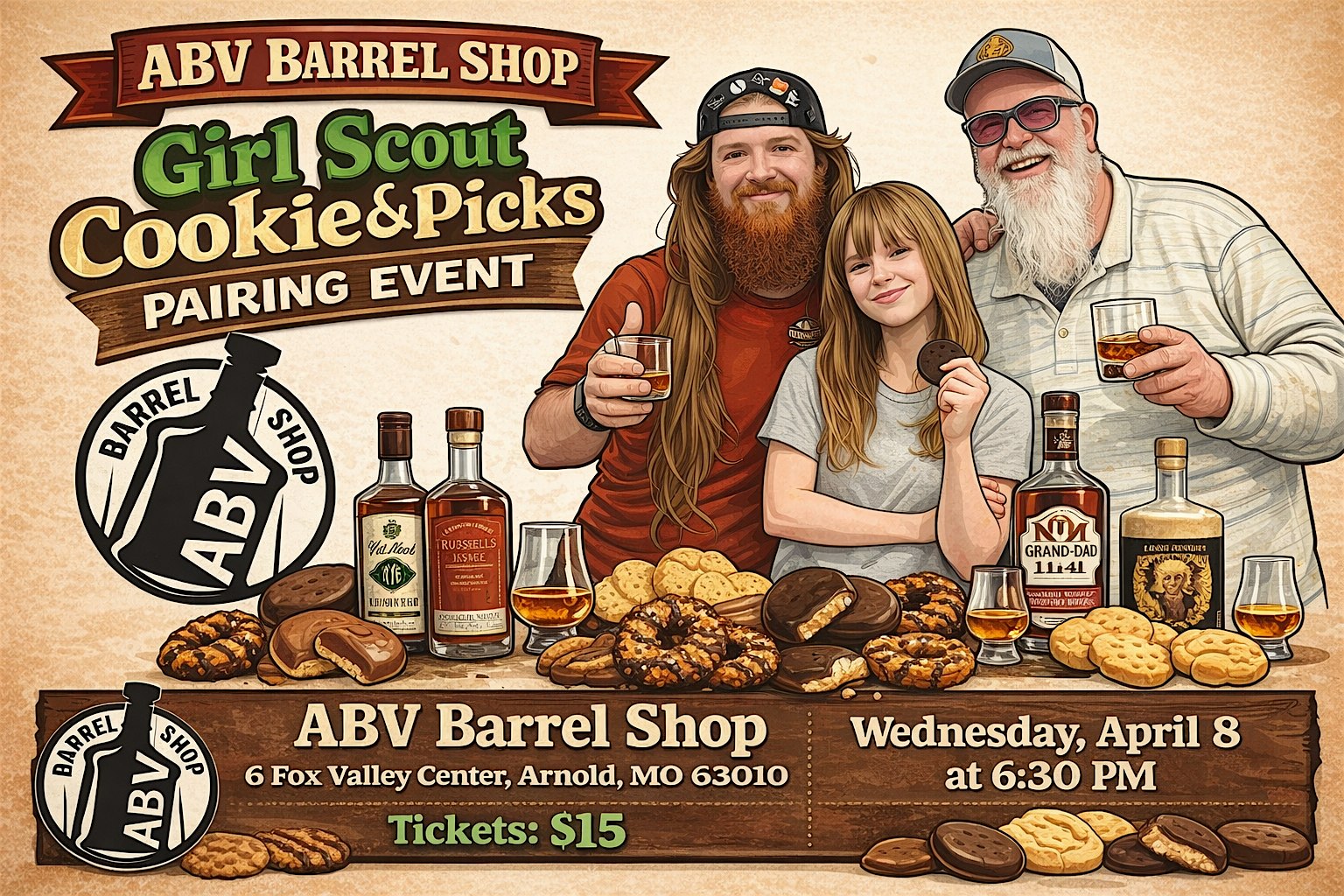 by admin27Feb ABV Barrel Shop Girl Scout Cookies & Barrel Picks Pairing Event at ABV Barrel Shop – Arnold, MO ABV Barrel Shop Girl Scout Cookies & Barrel Picks Pairing Event at ABV Barrel Shop – Arnold, MO 1 1 people viewed this event. This is an ABV Barrel Shop tradition… Girl Scout Cookies and our barrel picks featuring our owner Steve and his niece Tessa (a Girl Scout) Tickets-RSVP Link Date And Time Wednesday, April 8th, 2026 06:00 PM (PST) Venue ABV Barrel Shop Location 6 Fox Valley Center, Arnold, MO 63010 Event Types Food & Drink Event Category Missouri Share With Friends Facebook Twitter Linkedin Xing Pinterest Share This Post: