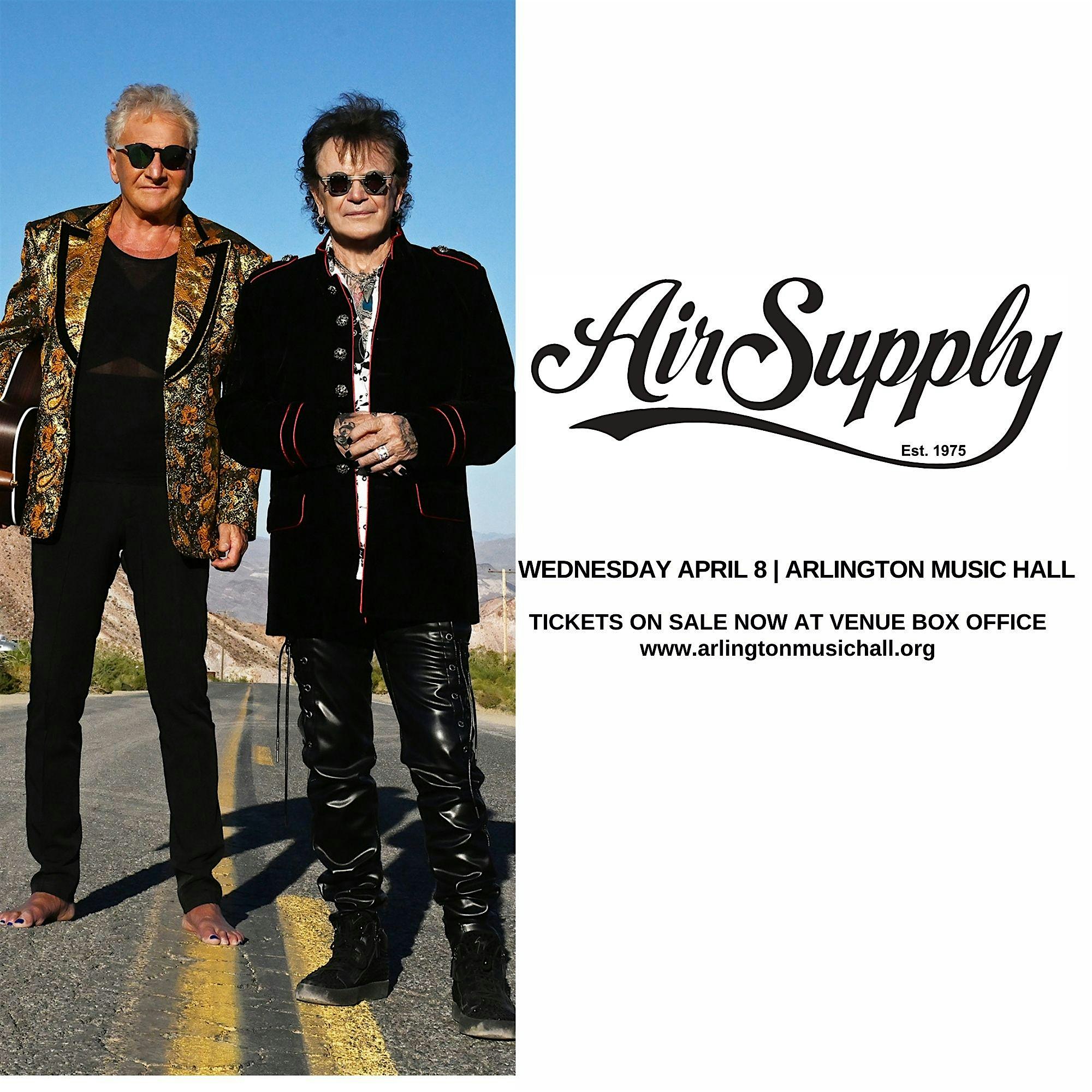 by admin24Feb Air Supply – 50th Anniversary Celebration at Arlington Music Hall – Arlington, TX Air Supply – 50th Anniversary Celebration at Arlington Music Hall – Arlington, TX 3 3 people viewed this event. Air Supply celebrates 50 years live at Arlington Music Hall, April 8, 2026. All Out of Love, Lost in Love & more. Tickets-RSVP Link Date And Time Wednesday, April 8th, 2026 07:00 PM (PST) Venue Arlington Music Hall Location 224 N Center St, Arlington, TX 76011 Event Types Concert or PerformanceMusic Event Category Texas Share With Friends Facebook Twitter Linkedin Xing Pinterest Share This Post: