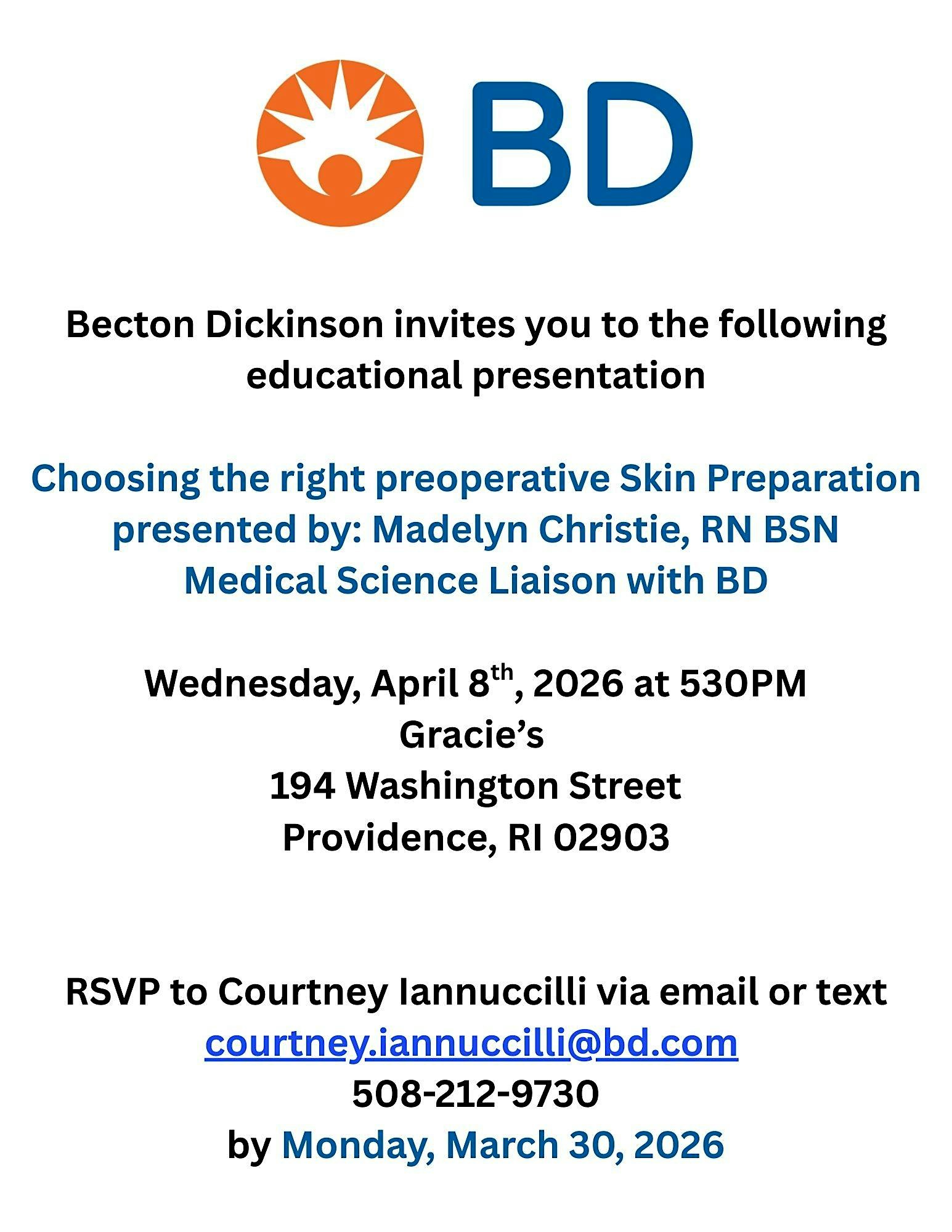 Come Join us for educational dinner at Gracie’s – Providence, RI Come Join us for educational dinner at Gracie’s – Providence, RI 1 1 people viewed this event. Learn about preoperative skin prep! Tickets-RSVP Link Register for event Date And Time Wednesday, April 8th, 2026 @ 05:00 PM Location 194 Washington Street, Providence, RIĀ 2903 Event Types Dinner or GalaFood & Drink Event Category ProvidenceRhode Island Share With Friends Facebook Twitter Linkedin Xing Pinterest