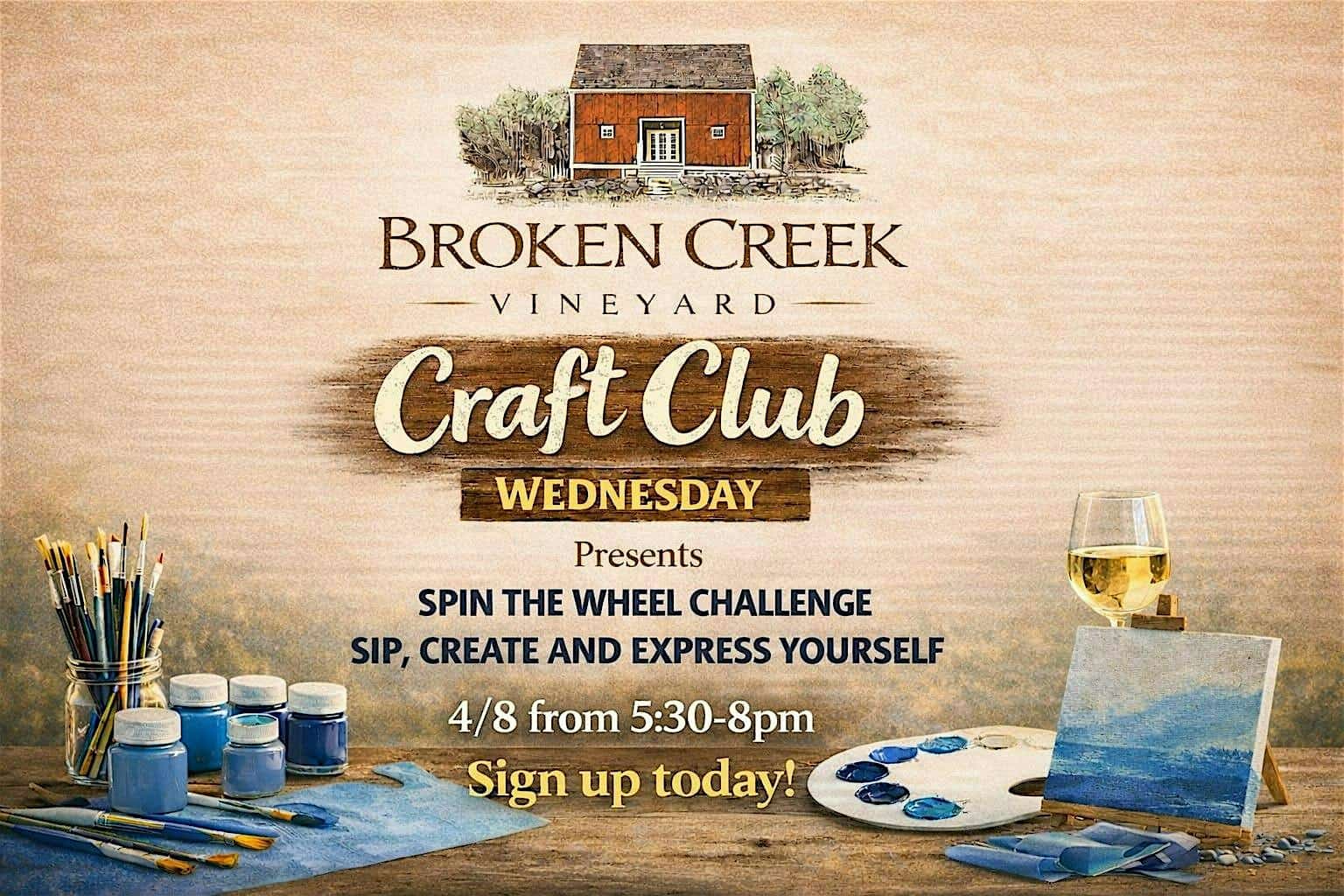 by admin24Feb Craft Club Wednesday: Spin The Wheel Challenge! at Broken Creek Vineyard and Winery – Shrewsbury, MA Craft Club Wednesday: Spin The Wheel Challenge! at Broken Creek Vineyard and Winery – Shrewsbury, MA 2 2 people viewed this event. Sip, create and express yourself during this fun, crafty challenge…while enjoying your favorite wines and sangrias, of course!! Tickets-RSVP Link Date And Time Wednesday, April 8th, 2026 05:00 PM (PST) Venue Broken Creek Vineyard and Winery Location 614 South Street, Shrewsbury, MA 1545 Event Types Food & Drink Event Category Massachusetts Share With Friends Facebook Twitter Linkedin Xing Pinterest Share This Post: