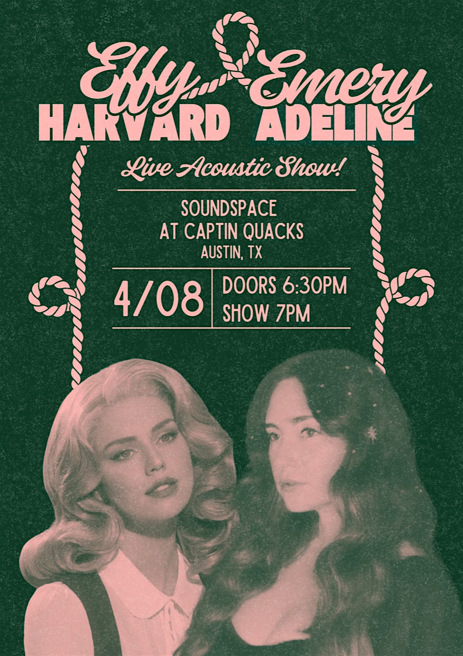 Effy Harvard & Emery Adeline at Captain Quack’s Soundspace – Austin, TX Effy Harvard & Emery Adeline at Captain Quack’s Soundspace – Austin, TX 1 1 people viewed this event. Join us for an evening with Effy Harvard & Emery Adeline Enjoy an evening of sweet country music from your favorite Austin songbirds, Effy Harvard and Emery Adeline! Doors 6:30 Show 7pm Tickets-RSVP Link Register for event Date And Time Wednesday, April 8th, 2026 @ 07:00 PM Location 5326 Menchaca Road, Austin, TX 78745 Event Types Concert or PerformanceMusic Event Category AustinTexas Share With Friends Facebook Twitter Linkedin Xing Pinterest