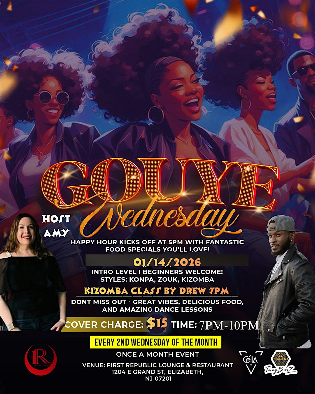 by admin13Feb Gouye Wednesday NJ at First Republic Lounge & Restaurant – Elizabeth, NJ Gouye Wednesday NJ at First Republic Lounge & Restaurant – Elizabeth, NJ 1 1 people viewed this event. Join us at once a month for an evening of konpa, zouk, kizomba, and Afro-Latin rhythms, all about whine, groove,with DJ Marc45 and Phildor. Tickets-RSVP Link Date And Time Wednesday, April 8th, 2026 11:00 PM (PST) Venue First Republic Lounge & Restaurant Location 1204 East Grand Street, Elizabeth, NJ 7201 Event Types Community & CultureParty or Social Gathering Event Category New Jersey Share With Friends Facebook Twitter Linkedin Xing Pinterest Share This Post: