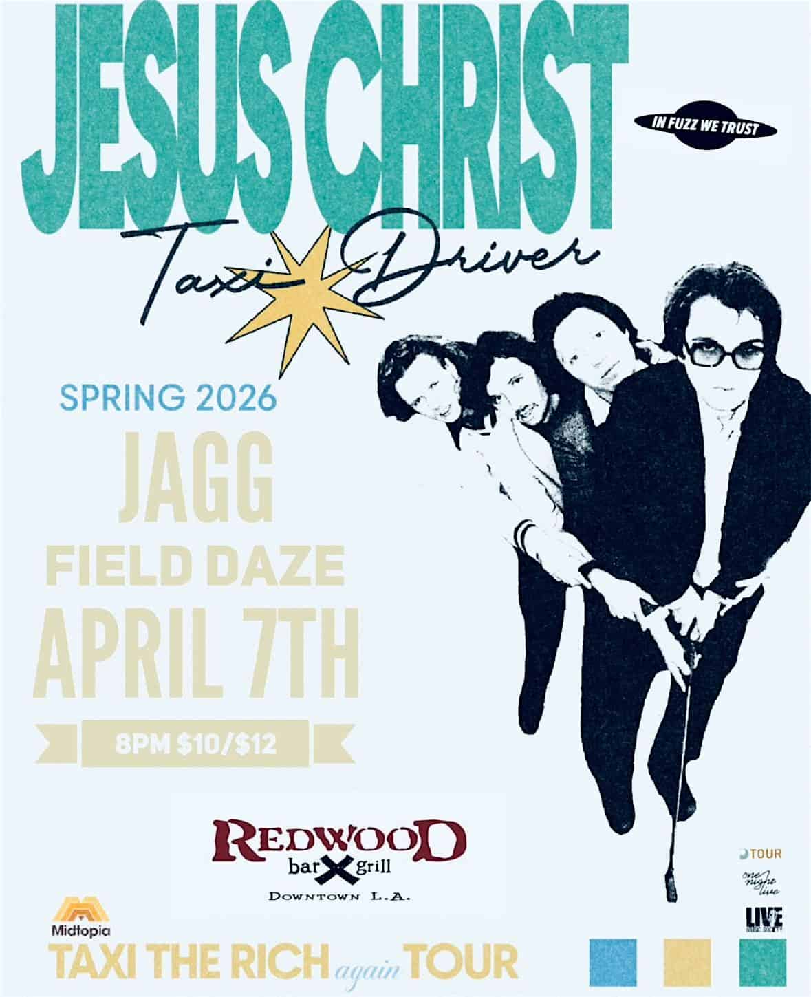by admin14Feb In Fuzz we Trust Presents Jesus Taxi Driver April 7th at the Redwood Bar at The Redwood Bar – Los Angeles, CA In Fuzz we Trust Presents Jesus Taxi Driver April 7th at the Redwood Bar at The Redwood Bar – Los Angeles, CA 1 1 people viewed this event. In Fuzz we Trust Presents Jesus Taxi Driver April 7th at the Redwood Bar w/ Jagg & Field Daze Tickets-RSVP Link Date And Time Wednesday, April 8th, 2026 03:00 AM (PST) Venue The Redwood Bar Location 316 West 2nd Street, Los Angeles, CA 90012 Event Types Concert or PerformancePerforming & Visual Arts Event Category CaliforniaLos Angeles Share With Friends Facebook Twitter Linkedin Xing Pinterest Share This Post: