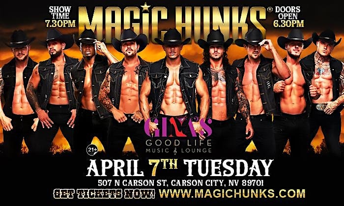 by admin14Feb MAGIC HUNKS® AUSTRALIA TAKEOVER CARSON CITY ,NV USA!!! at Gina’s – Carson City, NV MAGIC HUNKS® AUSTRALIA TAKEOVER CARSON CITY ,NV USA!!! at Gina’s – Carson City, NV 1 1 people viewed this event. Direct from Australia the Ultimate Girls Night Out is coming to Carson City! This Show will Sell Out! Get your Tickets Now! 21+ Doors 6:30pm Tickets-RSVP Link Date And Time Wednesday, April 8th, 2026 02:00 AM (PST) Venue Gina's Location 507 North Carson Street, Carson City, NV 89701 Event Types Concert or PerformancePerforming & Visual Arts Event Category Nevada Share With Friends Facebook Twitter Linkedin Xing Pinterest Share This Post: