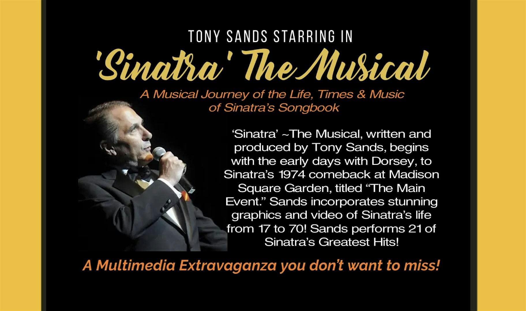 by admin14Feb SINATRA’ ~ The Musical: starring Tony Sands at Norris Center – Naples, FL SINATRA’ ~ The Musical: starring Tony Sands at Norris Center – Naples, FL 1 1 people viewed this event. You’ll never get a chance to see Sinatra, or even Sinatra Jr. perform in concert, but some people say that Sands is THE NEXT BEST THING! Tickets-RSVP Link Date And Time Wednesday, April 8th, 2026 11:00 PM (PST) Venue Norris Center Location 755 8th Avenue South, Naples, FL 34102 Event Types Concert or PerformancePerforming & Visual Arts Event Category Florida Share With Friends Facebook Twitter Linkedin Xing Pinterest Share This Post: