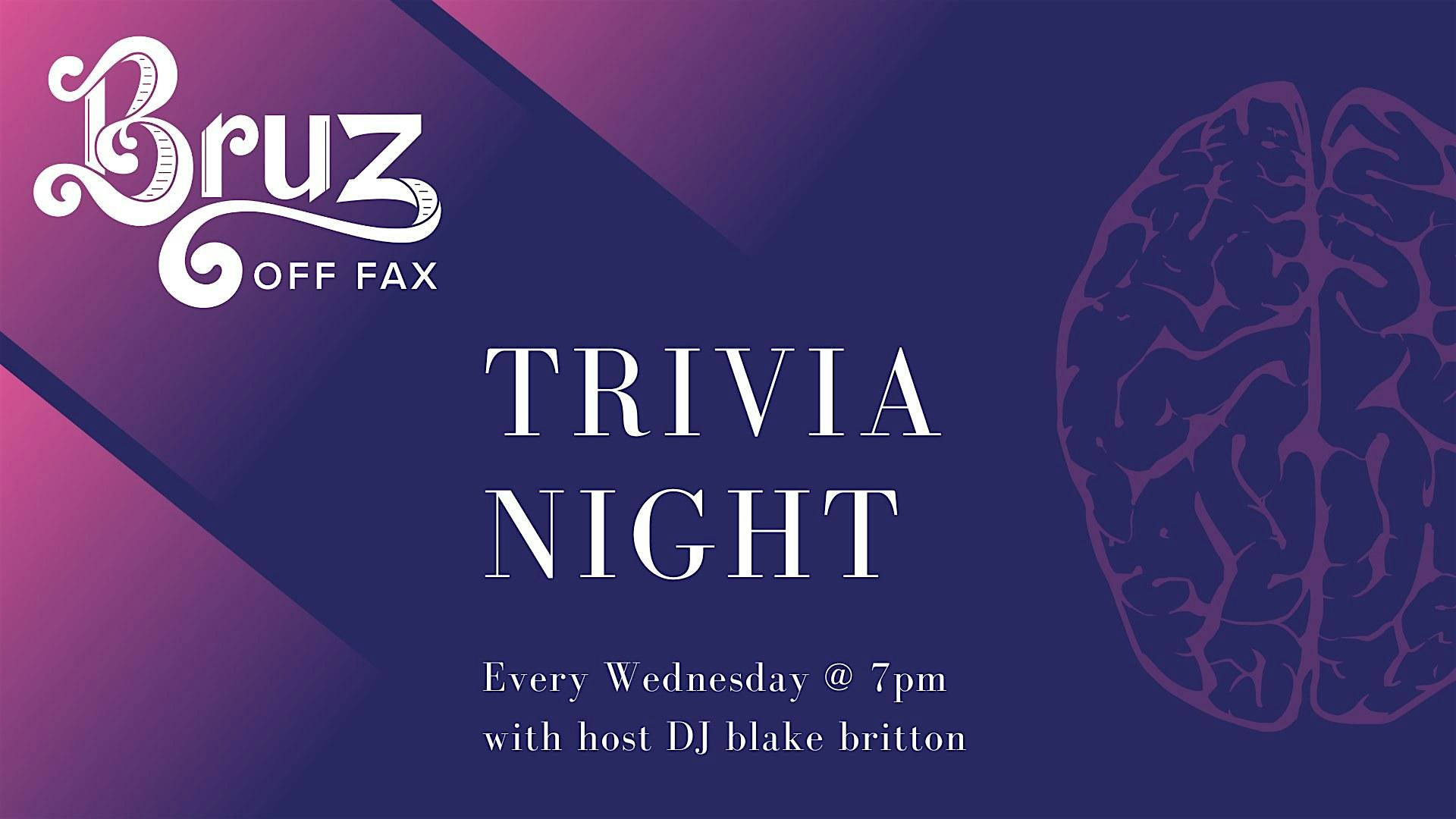 Trivia Night at Bruz Off Fax at Bruz Off Fax – Denver, CO Trivia Night at Bruz Off Fax at Bruz Off Fax – Denver, CO 1 1 people viewed this event. Join us and our/your favorite host DJ blake britton for Trivia Night. Every Wednesday at 7pm! Tickets-RSVP Link Register for event Date And Time Wednesday, April 8th, 2026 @ 07:00 PM Location 1495 York Street, Denver, CO 80206 Event Types Food & DrinkGame or Competition Event Category ColoradoDenver Share With Friends Facebook Twitter Linkedin Xing Pinterest