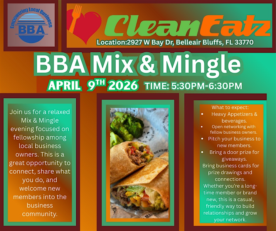 by admin27Feb BBA Mix & Mingle hosted by Clean Eatz at Clean Eatz, West Bay Drive, Belleair Bluffs, FL, USA – Belleair Bluffs, FL BBA Mix & Mingle hosted by Clean Eatz at Clean Eatz, West Bay Drive, Belleair Bluffs, FL, USA – Belleair Bluffs, FL 2 2 people viewed this event. Mix & Mingle focused on great opportunity and local businesses Tickets-RSVP Link Date And Time Thursday, April 9th, 2026 05:00 PM (PST) Venue Clean Eatz, West Bay Drive, Belleair Bluffs, FL, USA Location 2927 West Bay Drive, Belleair Bluffs, FL 33770 Event Types Food & DrinkParty or Social Gathering Event Category Florida Share With Friends Facebook Twitter Linkedin Xing Pinterest Share This Post: