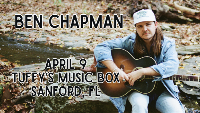 Tuffys Music Box Presents:Ben ChapmanTuffys Music Box & Lounge in Sanford, FLThursday, April 9th, 2026 DOORS : 7 PMSHOWTIME : 8 PMAGES: 18+Ben Chapman is a road warrior who has spent the previous three years in a whirlwind of activity writing songs for friends like Hayes Carll, Brent Cobb, and Marcus King; making his Grand Ole Opry debut; and releasing three acclaimed albums of country-fried funky-tonk, but nothing could have prepared him for what 2025 would bring him. His new record Feet on Fire captures that period of wild transition, with songs inspired by Chapmans marriage to fellow songwriter Meg McRee and the arrival of the couples first child. On songs like the guitar-driven title track, Chapman mixes Pink Floyd atmosphere with Crazy Horse crunch, showcasing the full spread of his musical influences. Elsewhere, he tips his hat to his southern roots with the laidback, loping Out in the Country and the Stax-sized soul ballad Missing You. Produced by Grammy-nominated songwriter and producer Anderson East, Feet on Fire captures Ben Chapman as weve never heard him before: his back against the wall and his heart full, determined not only to meet the challenges up ahead, but to write about the process, too. Address: 200 Myrtle Ave, Sanford, FL 32771www.TuffysMusicBox.com**We are committed to making our venue accessible to all patrons. Our facility meets all Americans with Disabilities Act (ADA) requirements, including accessible entrances and restrooms. Reserved tables are an upgrade subject to availability. If you have specific accessibility needs or requests, please dont hesitate to contact us in advance of your visit, or alert one of our staff members, and we will do our best to accommodate you.**
