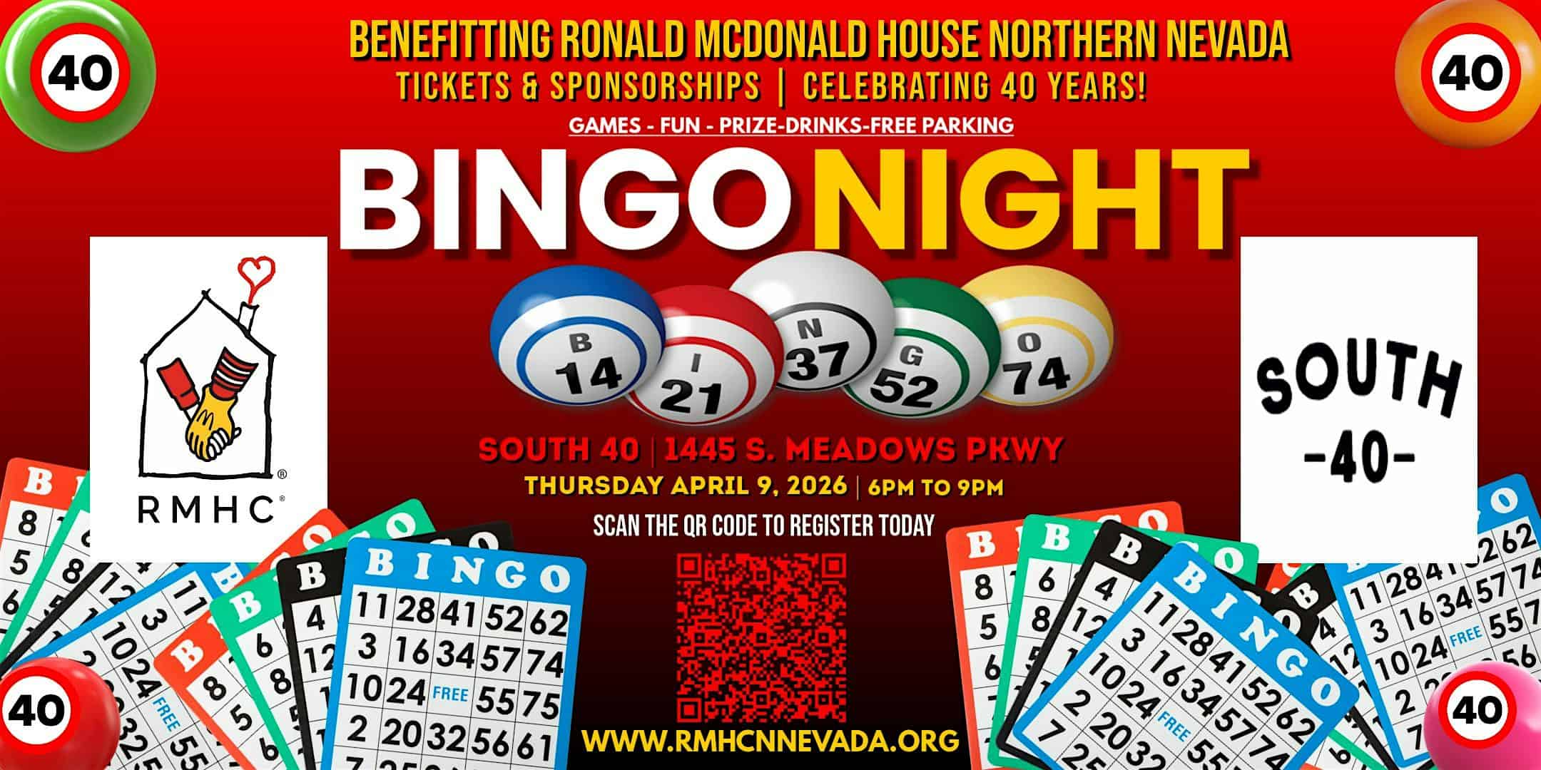 by admin23Feb Bingo for Ronald McDonald House Northern Nevada Celebrating 40 Years! at South 40 – Reno, NV Bingo for Ronald McDonald House Northern Nevada Celebrating 40 Years! at South 40 – Reno, NV 2 2 people viewed this event. Join the fun at South 40 as we celebrate Ronald McDonald House Northern Nevada’s 40th year of keeping families close! Tickets-RSVP Link Date And Time Thursday, April 9th, 2026 06:00 PM (PST) Venue South 40 Location 1445 South Meadows Parkway, Reno, NV 89521 Event Types Charity & CausesParty or Social Gathering Event Category NevadaReno Share With Friends Facebook Twitter Linkedin Xing Pinterest Share This Post: