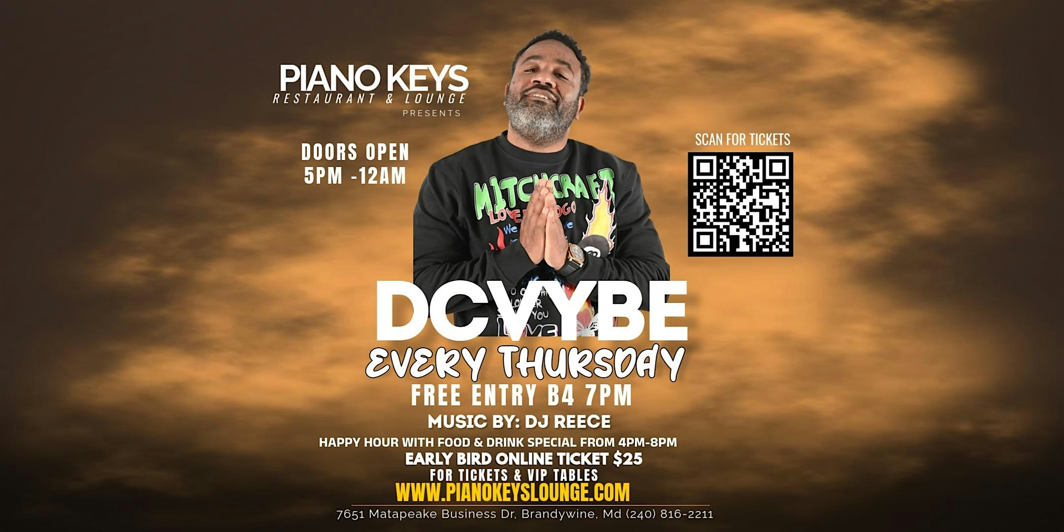 DCVYBE Live @ Piano Keys Lounge. Every Thursday at Piano Keys Restaurant and Lounge – Brandywine, MD DCVYBE Live @ Piano Keys Lounge. Every Thursday at Piano Keys Restaurant and Lounge – Brandywine, MD 3 3 people viewed this event. DCVYBE Live @ Piano Keys Restaurant & Lounge – Hosted Dickson Tickets-RSVP Link Register for event Date And Time Thursday, April 9th, 2026 @ 07:00 PM Location 7651 Matapeake Business Drive, Brandywine, MD 20613 Event Types Concert or PerformanceFood & Drink Event Category MarylandNational Harbor Share With Friends Facebook Twitter Linkedin Xing Pinterest
