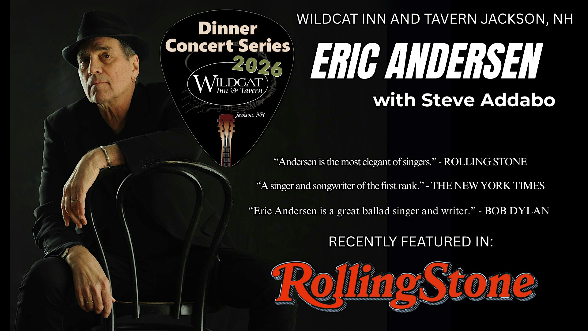 by admin13Feb Eric Andersen with Steve Addabo at Wildcat Inn & Tavern – Jackson, NH Eric Andersen with Steve Addabo at Wildcat Inn & Tavern – Jackson, NH 2 2 people viewed this event. International Recording/Performing Artist and Hit Song Writer Eric Andersen joined by guitarist Steve Addabo Tickets-RSVP Link Date And Time Thursday, April 9th, 2026 11:00 PM (PST) Venue Wildcat Inn & Tavern Location 94 Main Street, Jackson, NH 3846 Event Types Concert or PerformanceMusic Event Category New Hampshire Share With Friends Facebook Twitter Linkedin Xing Pinterest Share This Post: