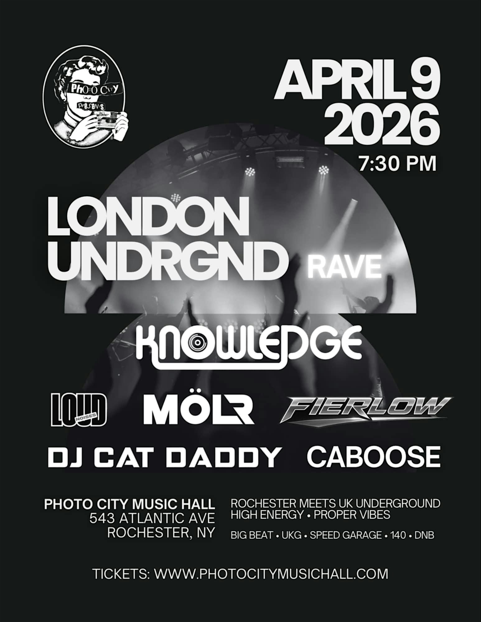 by admin27Feb LONDON UNDRGRND RAVE – Rochester, NY at Photo City Music Hall – Rochester, NY LONDON UNDRGRND RAVE – Rochester, NY at Photo City Music Hall – Rochester, NY 2 2 people viewed this event. Basslines rolling. Rewinds flying. No filler — just that gritty, warehouse-ready sound straight out of London. Tickets-RSVP Link Date And Time Thursday, April 9th, 2026 07:00 PM (PST) Venue Photo City Music Hall Location 543 Atlantic Ave, Rochester, NY 14609 Event Types Concert or PerformanceMusic Event Category New York Share With Friends Facebook Twitter Linkedin Xing Pinterest Share This Post: