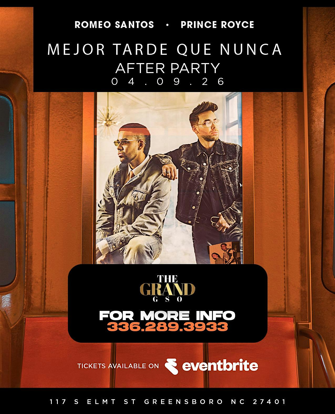 by admin13Feb ROMEO SANTOS X PRINCE ROYCE CONCERT AFTER PARTY -THE GRAND GSO | at THE GRAND GSO – Greensboro, NC ROMEO SANTOS X PRINCE ROYCE CONCERT AFTER PARTY -THE GRAND GSO | at THE GRAND GSO – Greensboro, NC 1 1 people viewed this event. Get ready to dance the night away with The After Party For Romeo Santos and Prince Royce Concert. Tickets-RSVP Link Date And Time Thursday, April 9th, 2026 02:00 PM (PST) Venue THE GRAND GSO Location 117 South Elm Street, Greensboro, NC 27401 Event Types MusicParty or Social Gathering Event Category GreensboroNorth Carolina Share With Friends Facebook Twitter Linkedin Xing Pinterest Share This Post: