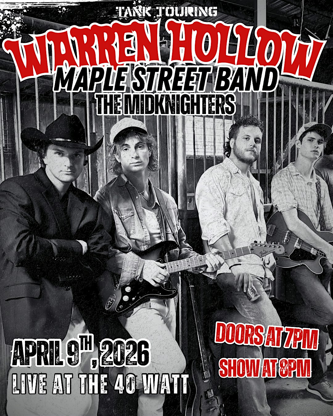 by admin13Feb Warren Hollow- Maple Street Band – The Midknighters at 40 Watt Club – Athens, GA Warren Hollow- Maple Street Band – The Midknighters at 40 Watt Club – Athens, GA 2 2 people viewed this event. Warren Hollow Tickets-RSVP Link Date And Time Thursday, April 9th, 2026 11:00 PM (PST) Venue 40 Watt Club Location 285 West Washington St, Athens, GA 30601 Event Types Concert or PerformanceMusic Event Category Georgia Share With Friends Facebook Twitter Linkedin Xing Pinterest Share This Post: