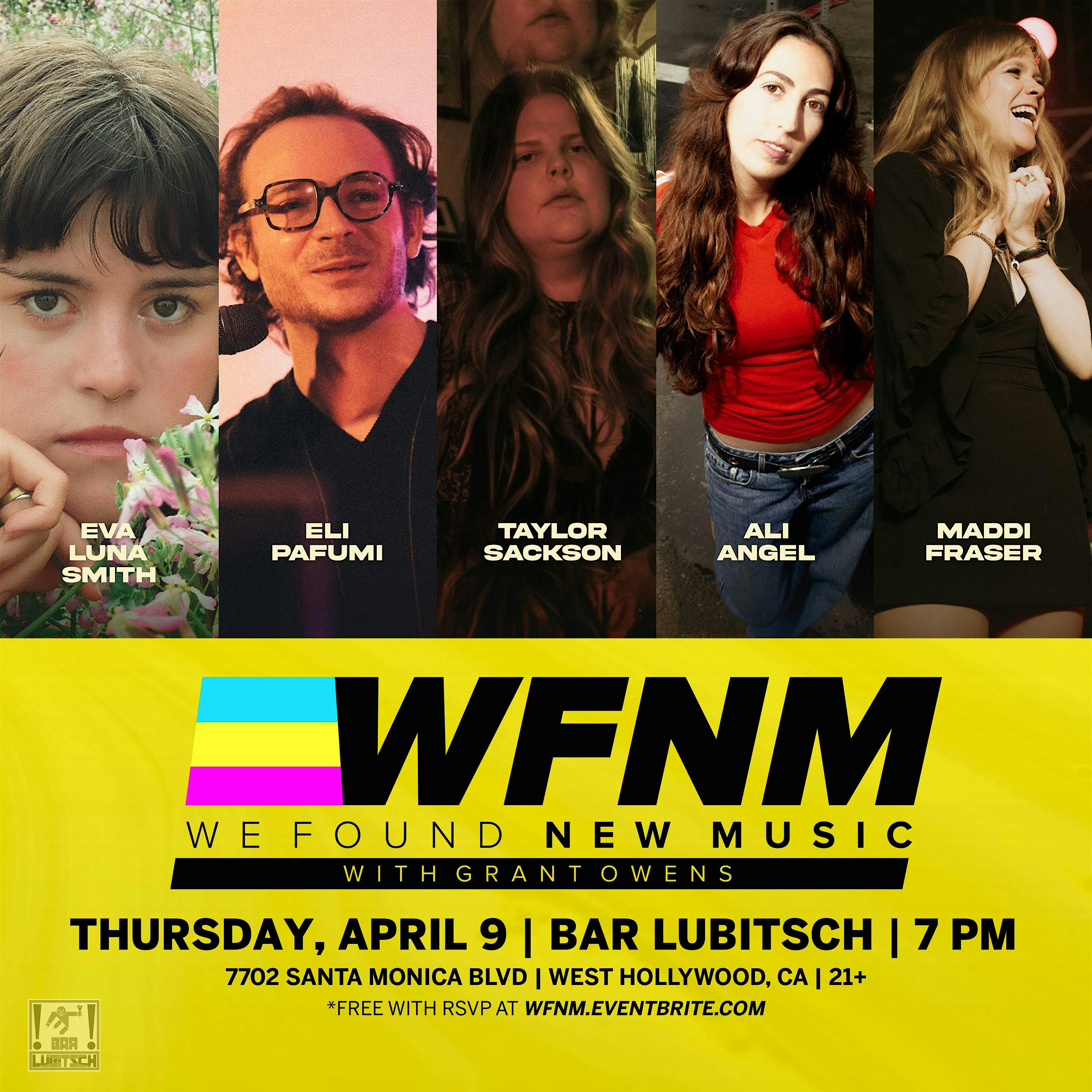 by admin24Feb WFNM presents Taylor Sackson and friends at BAR LUBITSCH – West Hollywood, CA WFNM presents Taylor Sackson and friends at BAR LUBITSCH – West Hollywood, CA 2 2 people viewed this event. WE FOUND NEW MUSIC Artist Discovery Concert Series LOCATION: Bar Lubitsch Free with RSVP 21+. 7:00pm Doors Tickets-RSVP Link Date And Time Thursday, April 9th, 2026 07:00 PM (PST) Venue BAR LUBITSCH Location 7702 Santa Monica Blvd, West Hollywood, CA 90046 Event Types Concert or PerformanceMusic Event Category California Share With Friends Facebook Twitter Linkedin Xing Pinterest Share This Post: