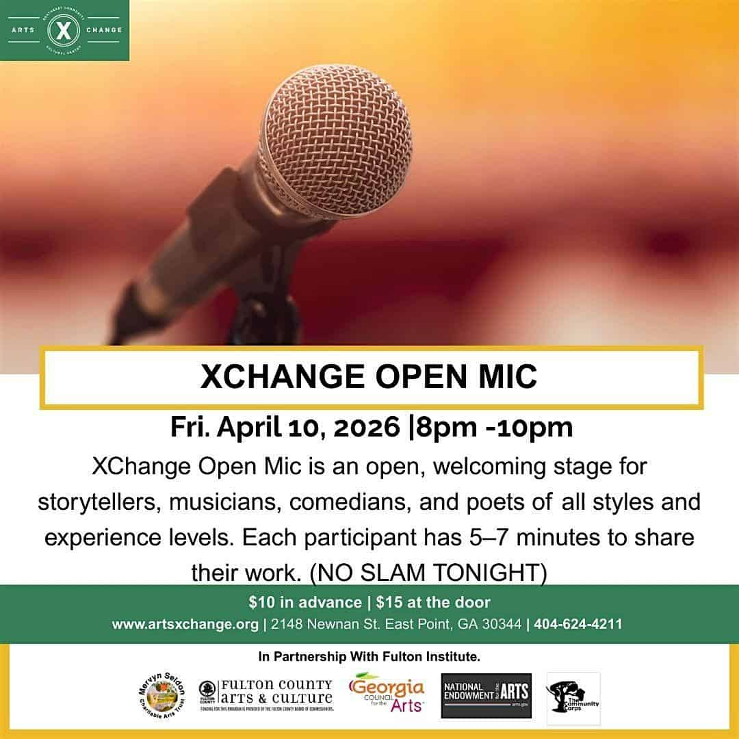 by admin14Feb April XChange Open Mic 4-10-26 at ArtsXchange – East Point, GA April XChange Open Mic 4-10-26 at ArtsXchange – East Point, GA 1 1 people viewed this event. XChange Open Mic A bi-monthly celebration of voice, story, and sound Tickets-RSVP Link Date And Time Friday, April 10th, 2026 11:00 PM (PST) Venue ArtsXchange Location 2148 Newnan Street, East Point, GA 30344 Event Types Concert or PerformancePerforming & Visual Arts Event Category AtlantaGeorgia Share With Friends Facebook Twitter Linkedin Xing Pinterest Share This Post: