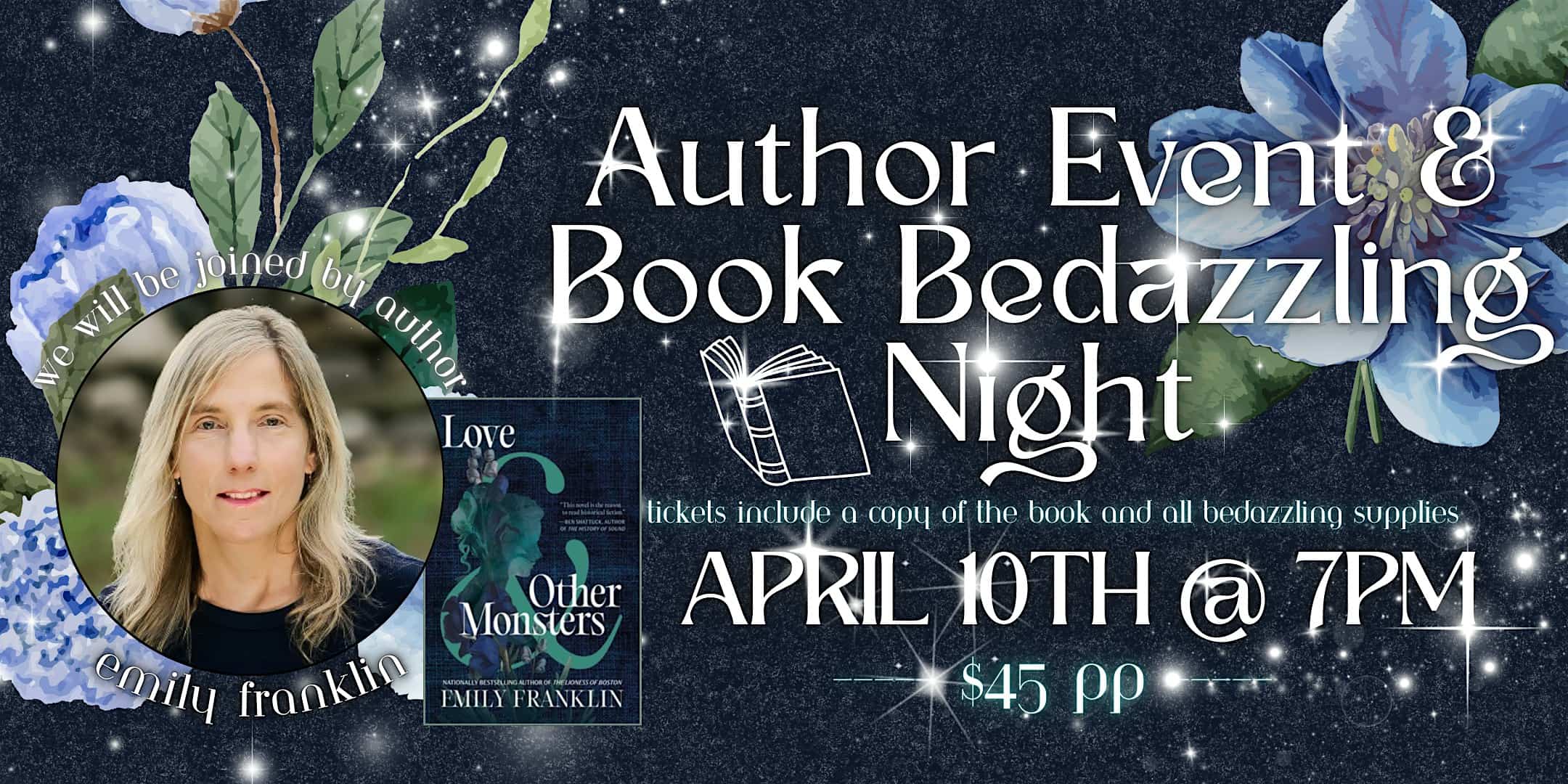 by admin23Feb Author Event & Book Bedazzling Night at Book Ends – Winchester, MA Author Event & Book Bedazzling Night at Book Ends – Winchester, MA 2 2 people viewed this event. We are hosting a very special book bedazzling night with local author Emily Franklin, as we highlight (and bedazzle) her new book! Tickets-RSVP Link Date And Time Friday, April 10th, 2026 07:00 PM (PST) Venue Book Ends Location 559 Main Street, Winchester, MA 1890 Event Types Party or Social Gathering Event Category Massachusetts Share With Friends Facebook Twitter Linkedin Xing Pinterest Share This Post: