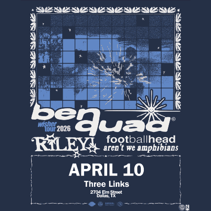 Ben Quad is coming to Three Links Deep Ellum with special guests: Riley!, Arent We Amphibians and FootballheadThis is an ALL AGES event.Please arrive with a physical form of government ID.GA standing room only.