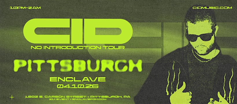 by admin27Feb CID – No Introduction Tour – Pittsburgh, PA at Enclave – Pittsburgh, PA CID – No Introduction Tour – Pittsburgh, PA at Enclave – Pittsburgh, PA 2 2 people viewed this event. CID makes a Pittsburgh stop on his No Introduction Tour! Enclave, 4.10.26 Tickets-RSVP Link Date And Time Friday, April 10th, 2026 10:00 PM (PST) Venue Enclave Location 1602 East Carson Street, Pittsburgh, PA 15203 Event Types Music Event Category PennsylvaniaPittsburgh Share With Friends Facebook Twitter Linkedin Xing Pinterest Share This Post:
