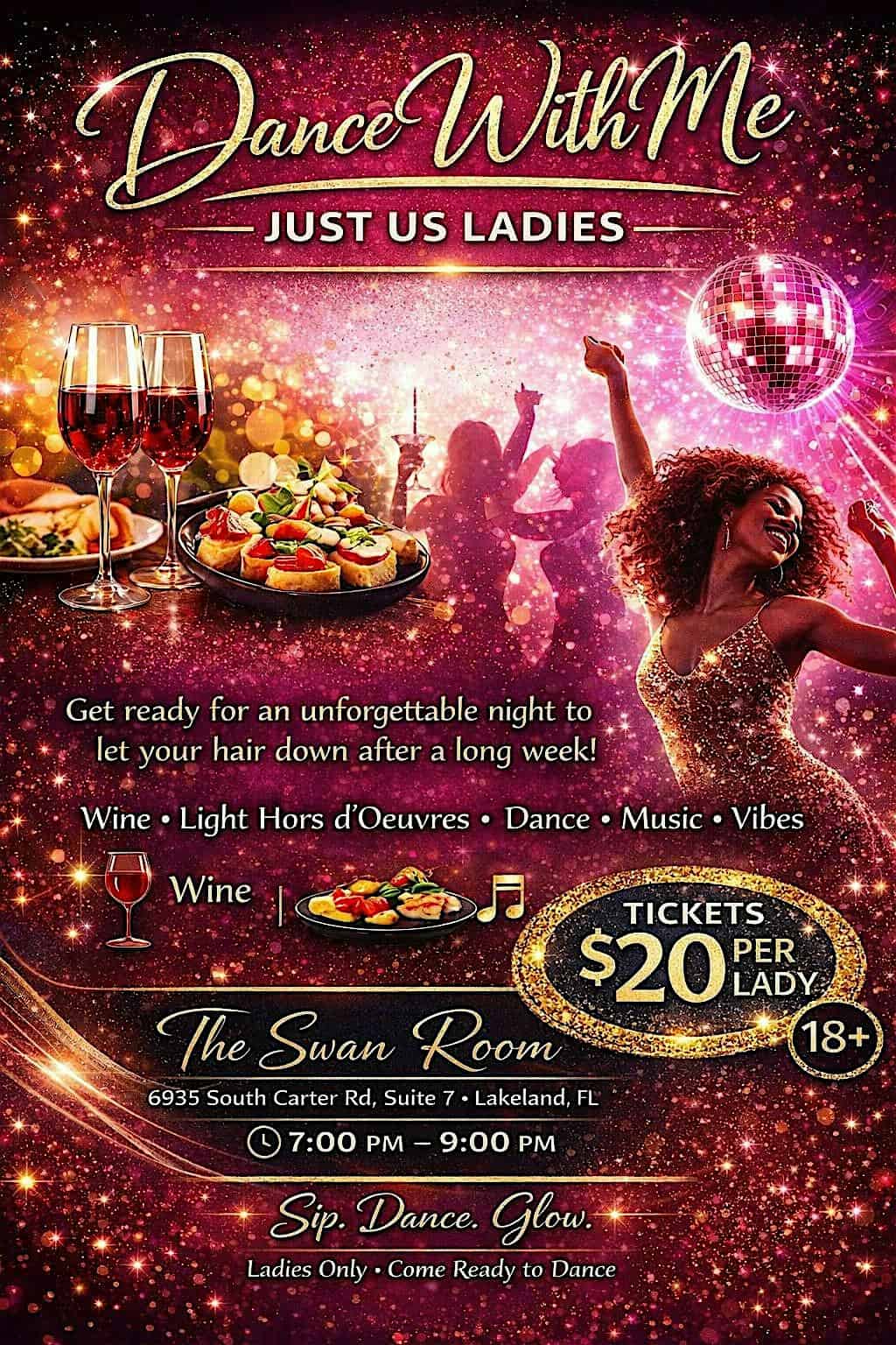 by admin14Feb Dance with Me – Just Us Ladies at The Swan Room – Lakeland, FL Dance with Me – Just Us Ladies at The Swan Room – Lakeland, FL 1 1 people viewed this event. Get ready for an unforgettable night to let your hair down after a long week! Sip, snack, and dance the night away in a vibrant atmosphere! Tickets-RSVP Link Date And Time Friday, April 10th, 2026 11:00 PM (PST) Venue The Swan Room Location 6935 South Carter Road, Lakeland, FL 33813 Event Types Party or Social Gathering Event Category Florida Share With Friends Facebook Twitter Linkedin Xing Pinterest Share This Post: