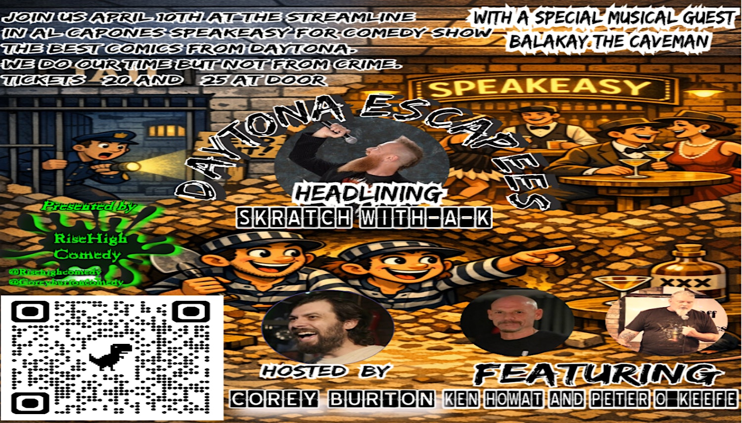 With Daytonas best comics Ken Howat, Peter O’Keefe, and Skratch with a K! All hosted by Corey Burton the producer of Rise High Comedy!