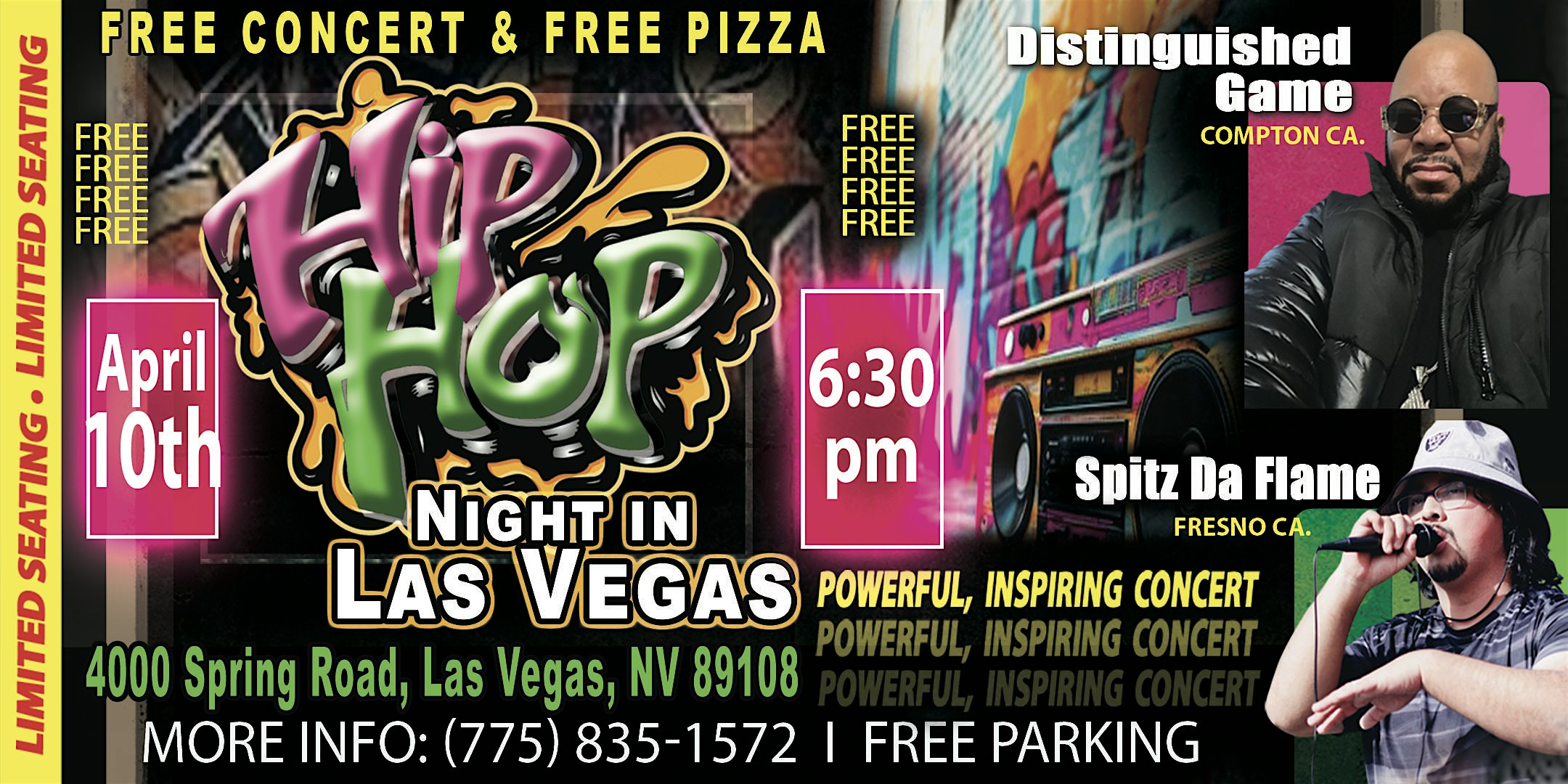 by admin24Feb Free HIP-HOP Concert & Free Pizza in LAS VEGAS at 4000 Spring Rd – Las Vegas, NV Free HIP-HOP Concert & Free Pizza in LAS VEGAS at 4000 Spring Rd – Las Vegas, NV 2 2 people viewed this event. This free concert is open to the greater Las Vegas area and Clark County! Tickets-RSVP Link Date And Time Friday, April 10th, 2026 06:00 PM (PST) Venue 4000 Spring Rd Location 4000 Spring Road, Las Vegas, NV 89108 Event Types Concert or PerformanceMusic Event Category Las VegasNevada Share With Friends Facebook Twitter Linkedin Xing Pinterest Share This Post: