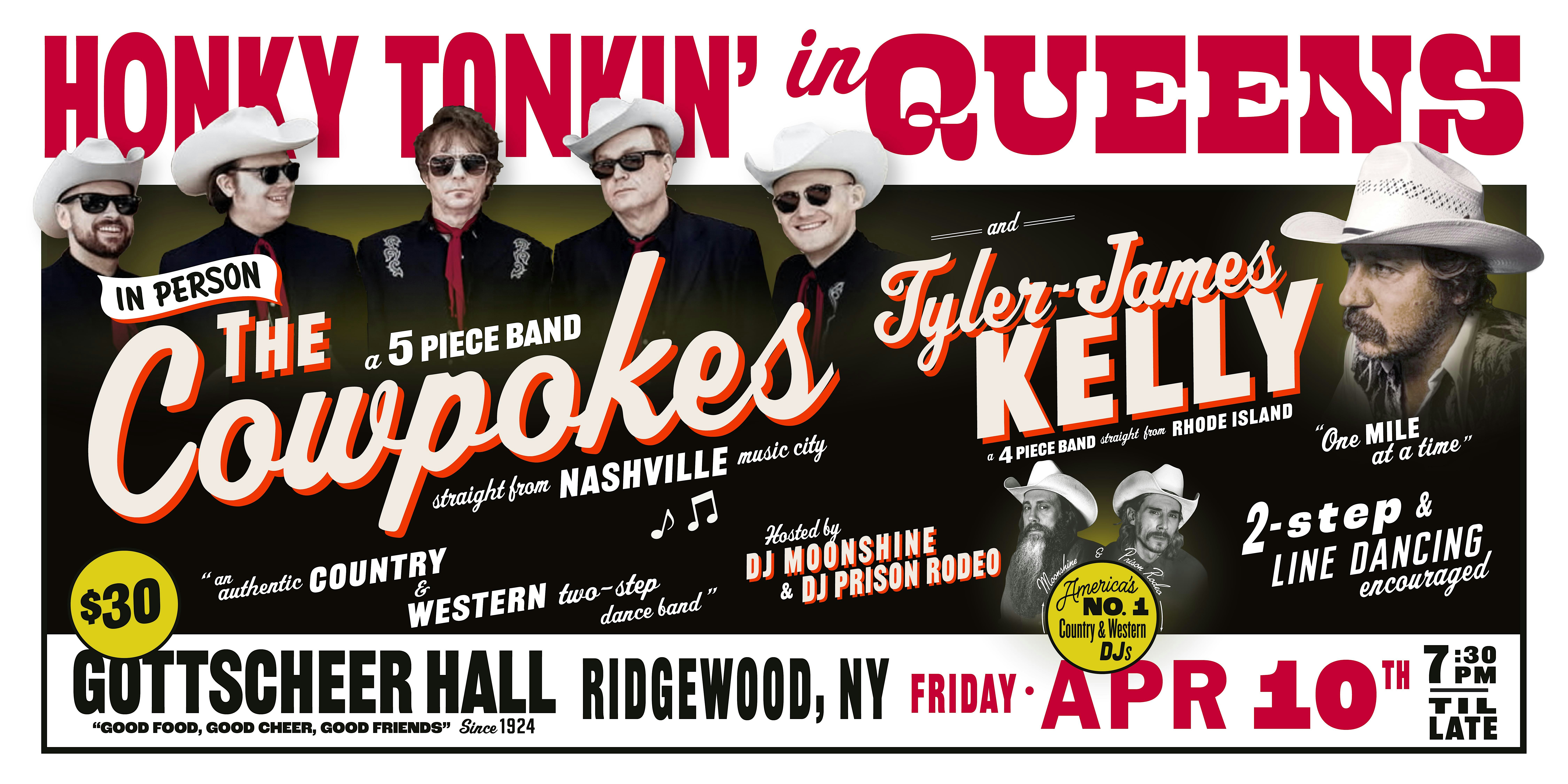 by admin13Feb Honky Tonkin’ in Queens in person The Cowpokes and Tyler James Kelly at Gottscheer Hall – Queens, NY Honky Tonkin’ in Queens in person The Cowpokes and Tyler James Kelly at Gottscheer Hall – Queens, NY 1 1 people viewed this event. Kick up your boots with The Cowpokes and Tyler James Kelly at Honky Tonkin’ in Queens, live and loud! Tickets-RSVP Link Date And Time Friday, April 10th, 2026 11:00 PM (PST) Venue Gottscheer Hall Location 657 Fairview Avenue, Queens, NY 11385 Event Types Concert or PerformanceMusic Event Category New YorkNew York City Share With Friends Facebook Twitter Linkedin Xing Pinterest Share This Post: