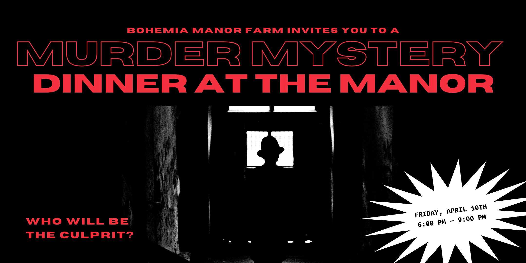 by admin14Feb Murder Mystery Dinner At The Manor at 237 Bohemia Manor Farm Ln – Chesapeake City, MD Murder Mystery Dinner At The Manor at 237 Bohemia Manor Farm Ln – Chesapeake City, MD 1 1 people viewed this event. Join us in the historic Manor House at Bohemia Manor Farm for an evening of suspense and fine dining. Tickets-RSVP Link Date And Time Friday, April 10th, 2026 10:00 PM (PST) Venue 237 Bohemia Manor Farm Ln Location 237 Bohemia Manor Farm Lane, Chesapeake City, MD 21915 Event Types Food & Drink Event Category Maryland Share With Friends Facebook Twitter Linkedin Xing Pinterest Share This Post: