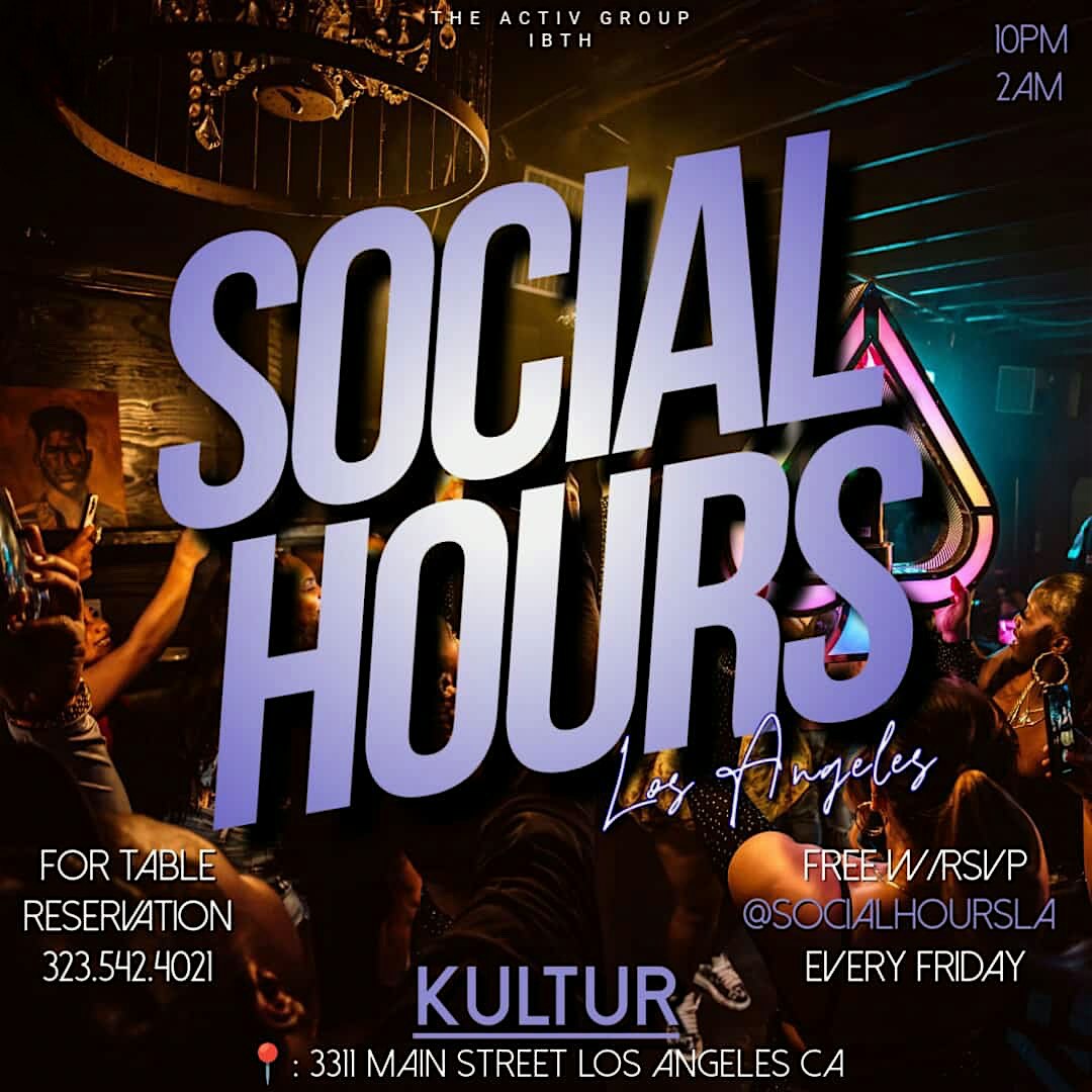 by admin27Feb SOCIAL HOURS LA at Kultur Lounge – Los Angeles, CA SOCIAL HOURS LA at Kultur Lounge – Los Angeles, CA 2 2 people viewed this event. This is where you want to be on Friday Night!! Tickets-RSVP Link Date And Time Friday, April 10th, 2026 10:00 PM (PST) Venue Kultur Lounge Location 3311 Main Street, Los Angeles, CA 90007 Event Types MusicParty or Social Gathering Event Category CaliforniaLos Angeles Share With Friends Facebook Twitter Linkedin Xing Pinterest Share This Post: