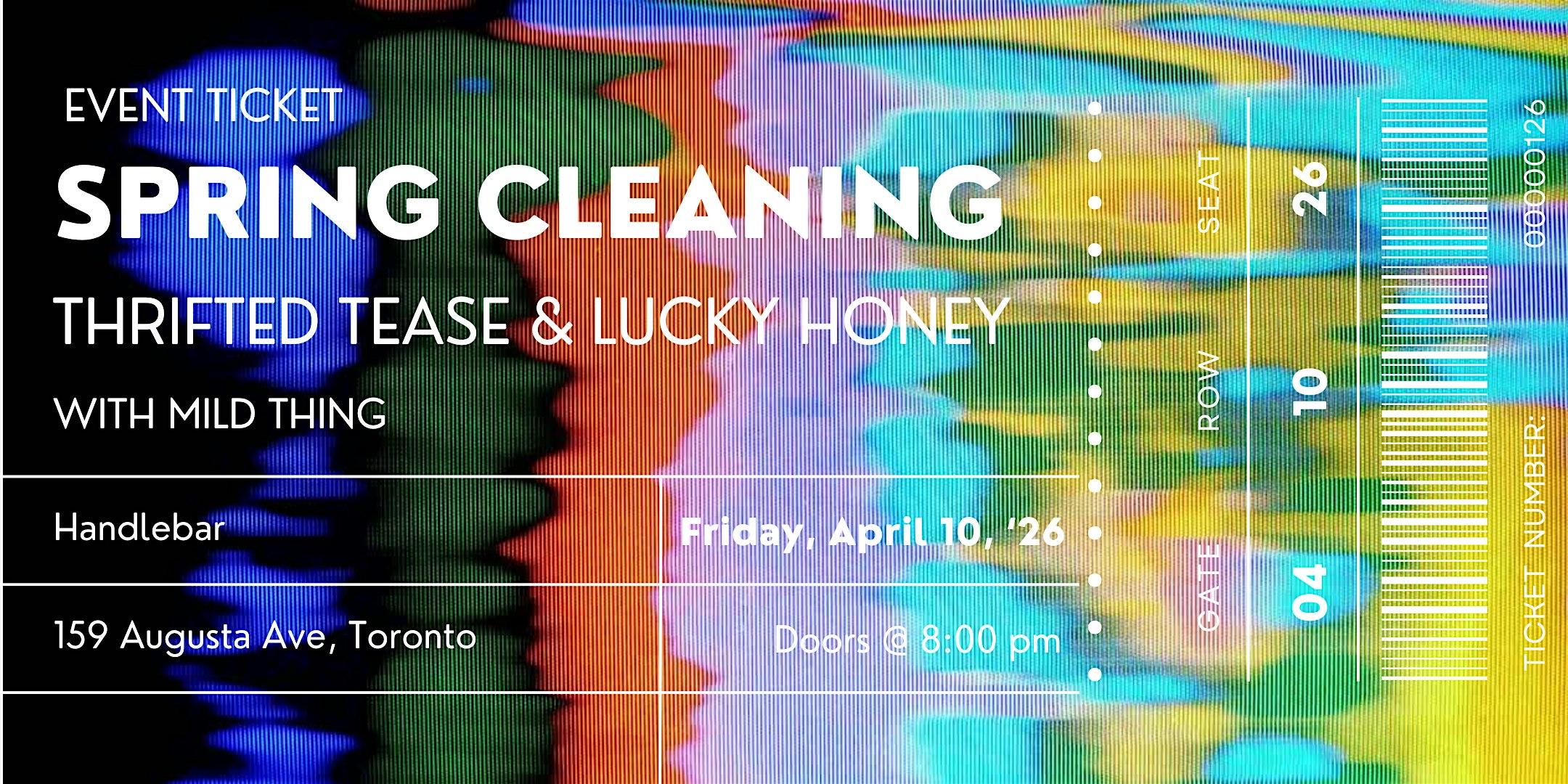 Spring Cleaning, Live at Handlebar at Handlebar – Toronto, Canada Spring Cleaning, Live at Handlebar at Handlebar – Toronto, Canada 5 5 people viewed this event. Indie pop night at Handlebar with Thrifted Tease, Lucky Honey, and Mild Thing. April 10 Doors 7:30 19+ Tickets-RSVP Link Register for event Date And Time Friday, April 10th, 2026 @ 09:00 PM Location 159 Augusta Avenue, Toronto, Canada M5T 2L4 Event Types Concert or PerformanceMusic Event Category CanadaToronto Share With Friends Facebook Twitter Linkedin Xing Pinterest
